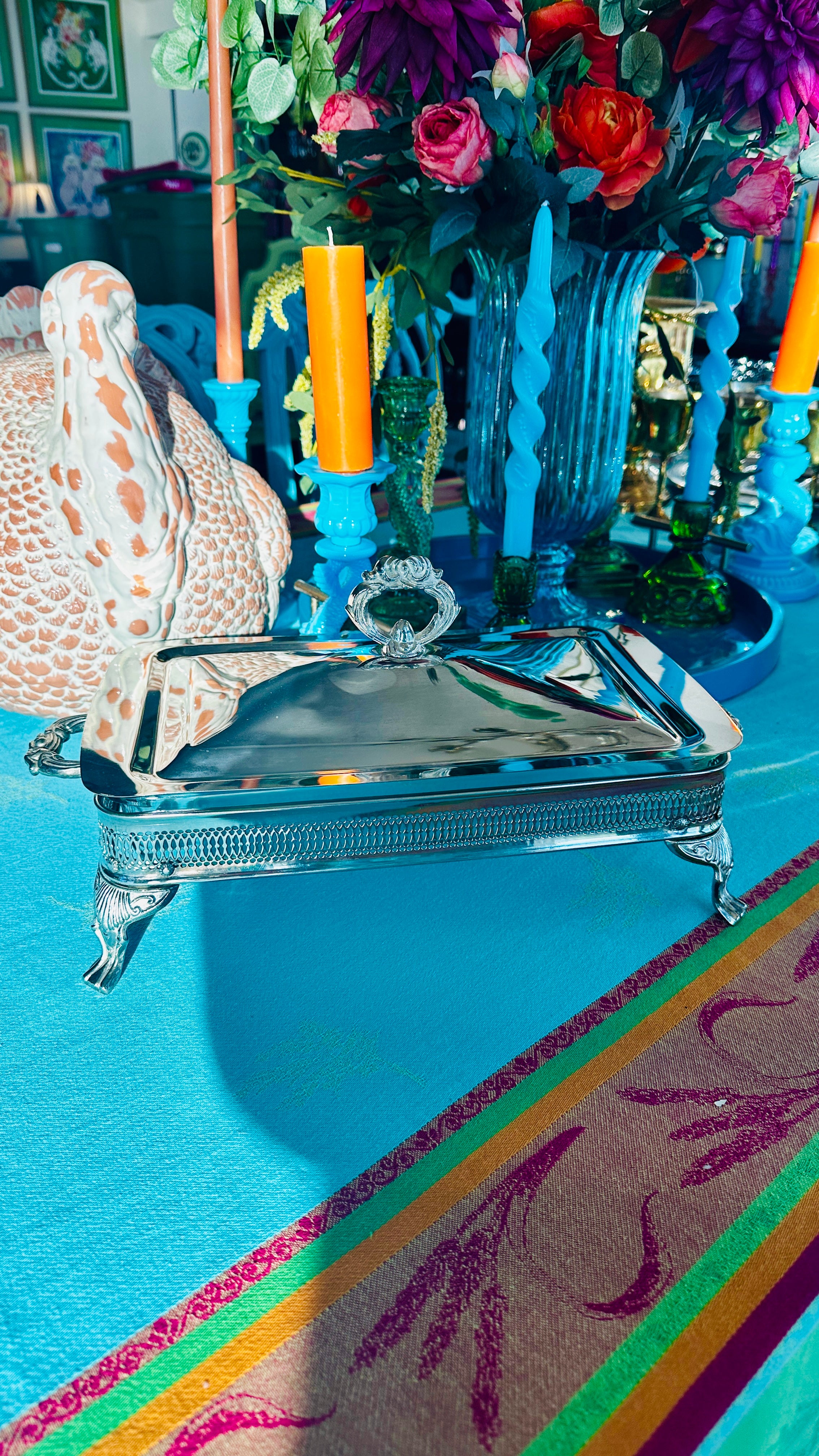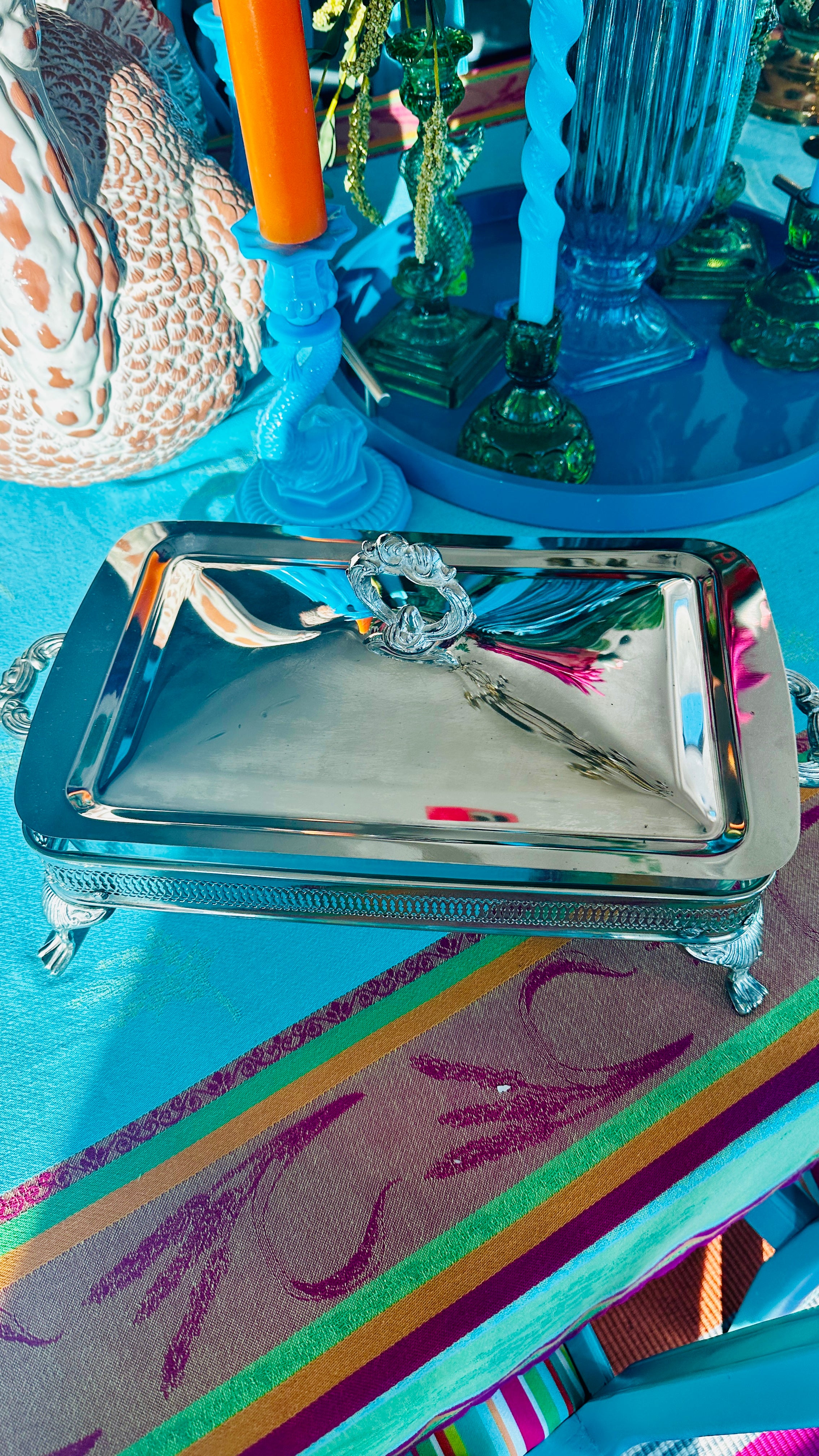 Serve your favorite dishes in style with this Vintage Silverplate Casserole Serving Piece. Featuring a rectangular design with a lid and glass insert, this piece is made in Hong Kong and combines elegant silverplate with functional design. Perfect for keeping meals warm while adding a touch of sophistication to any table setting. Some slight worn spots shown in pictures. The lid rests on top of the glass dish.