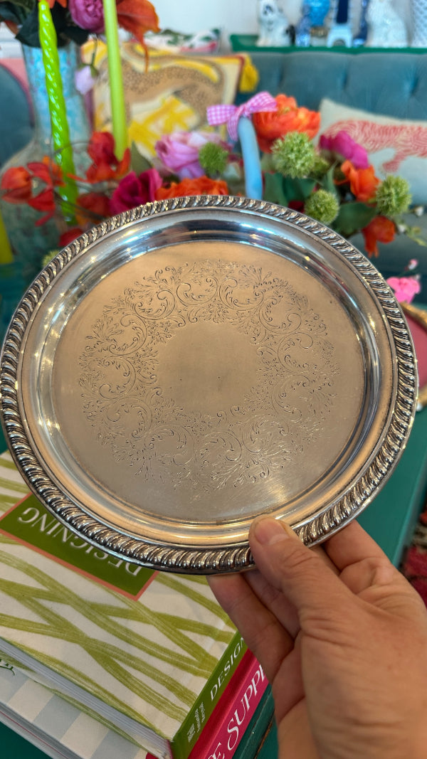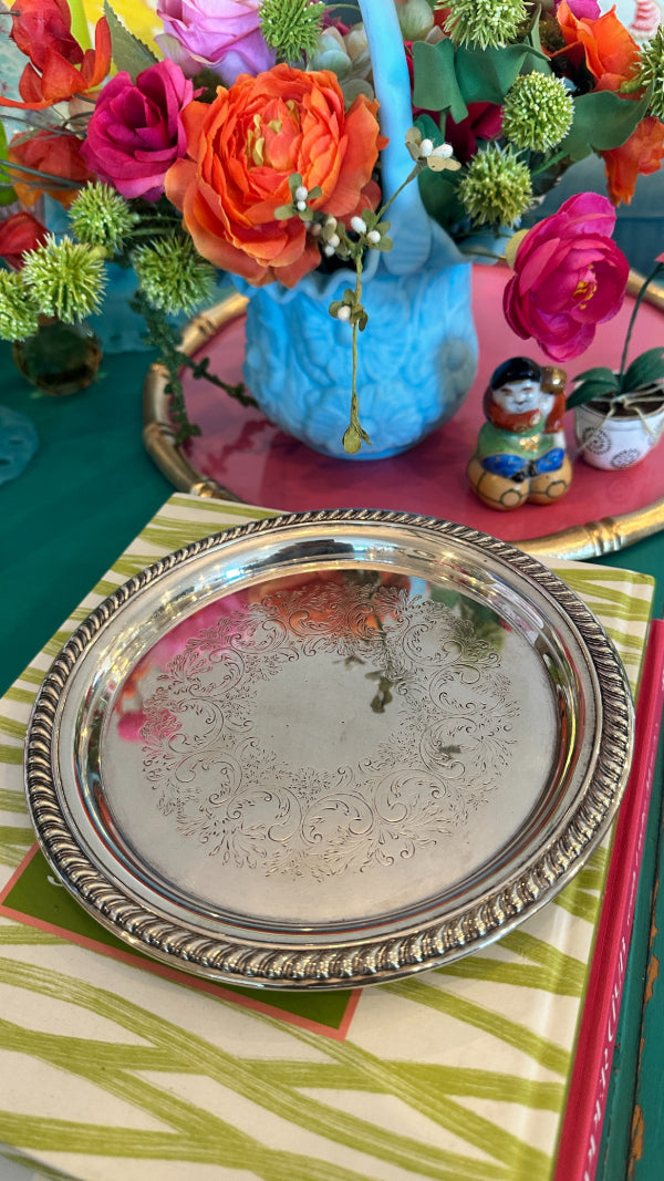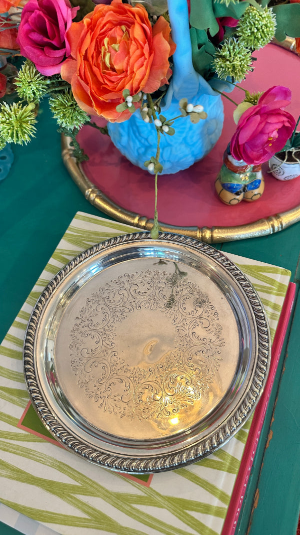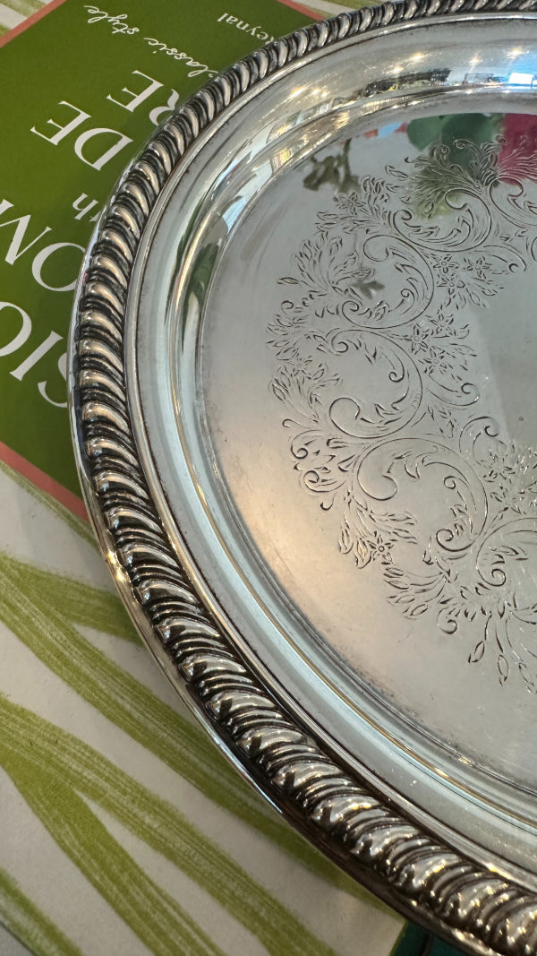 Enhance your hosting with this stunning vintage silverplate etched serving tray. Featuring intricate etched patterns that evoke timeless elegance, this tray adds sophistication to any occasion. Its durable silverplate construction and ornate design make it perfect for serving drinks, appetizers, or as a decorative centerpiece. Whether used for special gatherings or as a display piece, this tray’s vintage charm is sure to impress. A beautiful addition to any collection or home, blending both style and functionality.See picture details as they are part of the description.