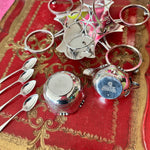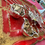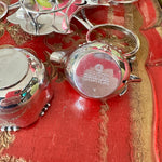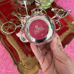 Discover the elegance of yesteryears with our Vintage Silverplate Tea Service. These exquisite pieces transport you to a bygone era, combining classic design with the enduring beauty of silverplate. This stunning set comes with a sturdy, well designed carrier, 4 spoons and a sugar and creamer. They are stamped a sun and these words: Mappin Brothers, 66 Cheapside,E.C. 220 Recent ST Wand, Queen's Works Sheffield, Queen's Plate. Sheffield plating was used in the 1800s and used more silver over copper than regular silver plating. Great vintage/antique condition. There are 4 round holes that would hold either teacups, berry bowls or egg cups. After extensive research I am unsure which this service set was used for. Truly a RARE FIND!