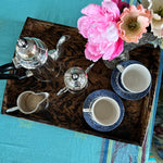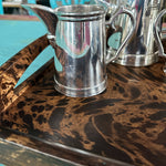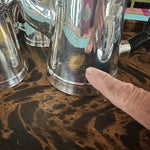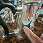 Looking for that perfect tea set to add to your buffet or sideboard. This is a rare beauty. All the mid century modern fees with a sleek, black handle on the tea pot and a black accent on the lids. The sugar container features double handles and stylish lid. The creamer has one handle and a spout. Some plating issues where the silverplate has been worn down to the copper undercoat. Otherwise great vintage condition.