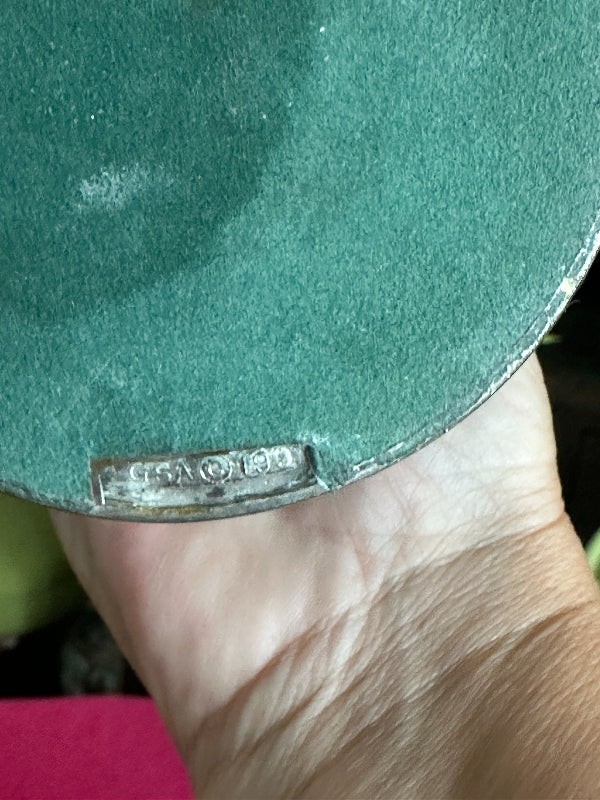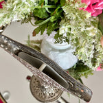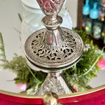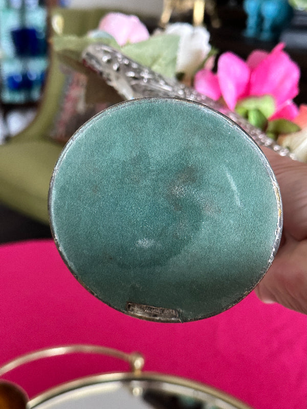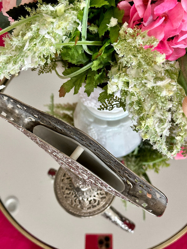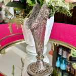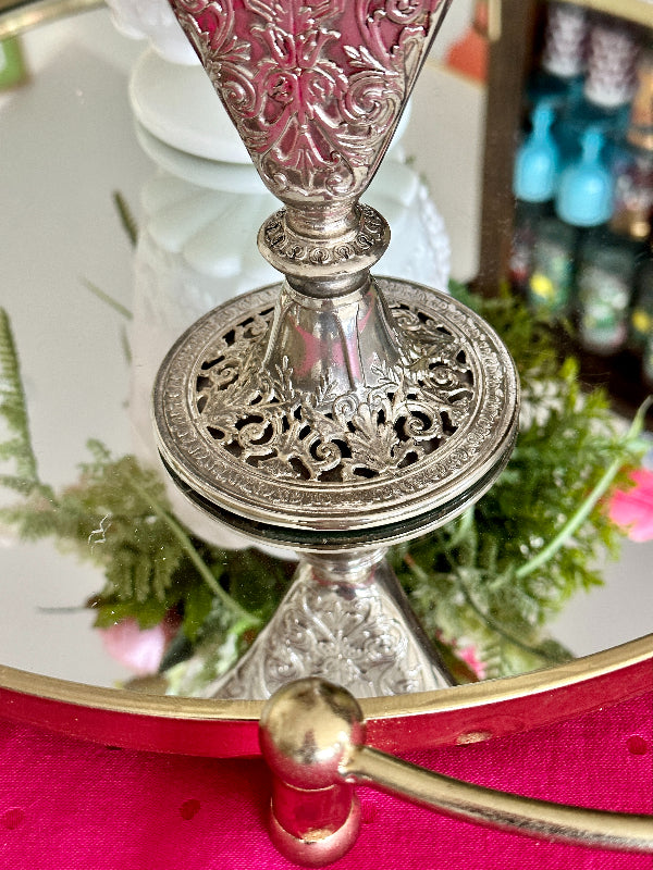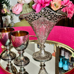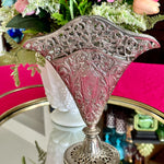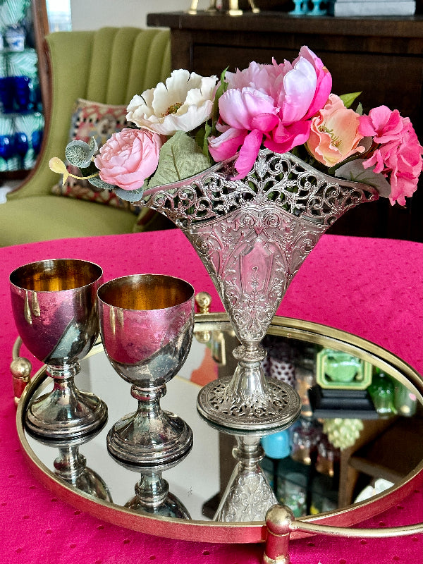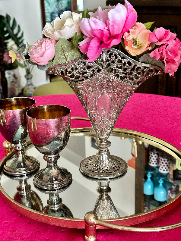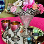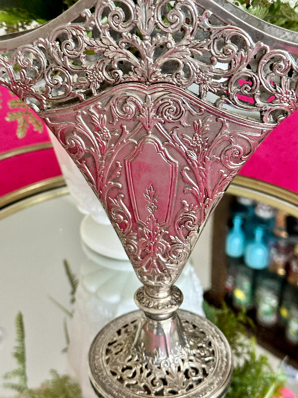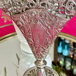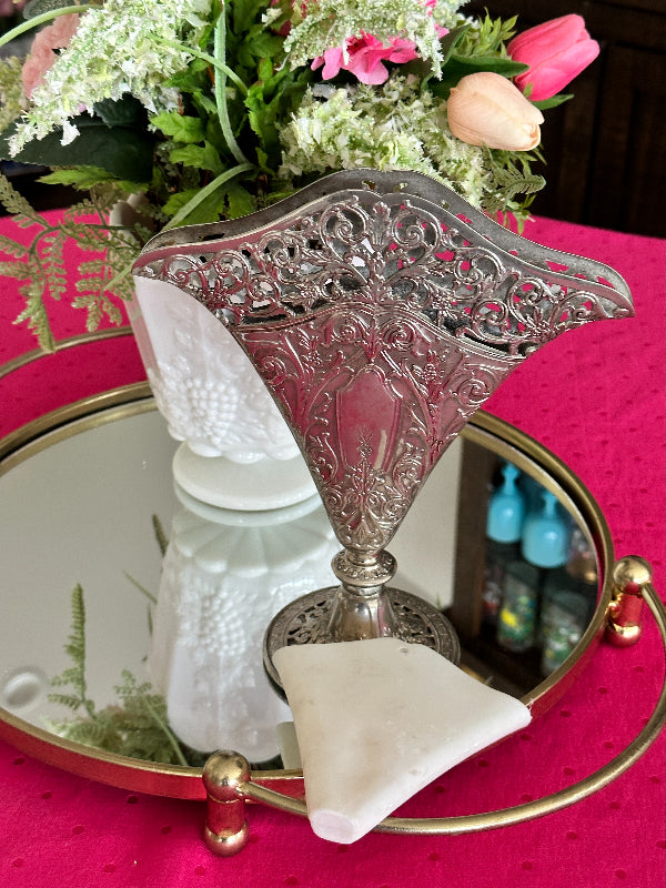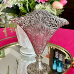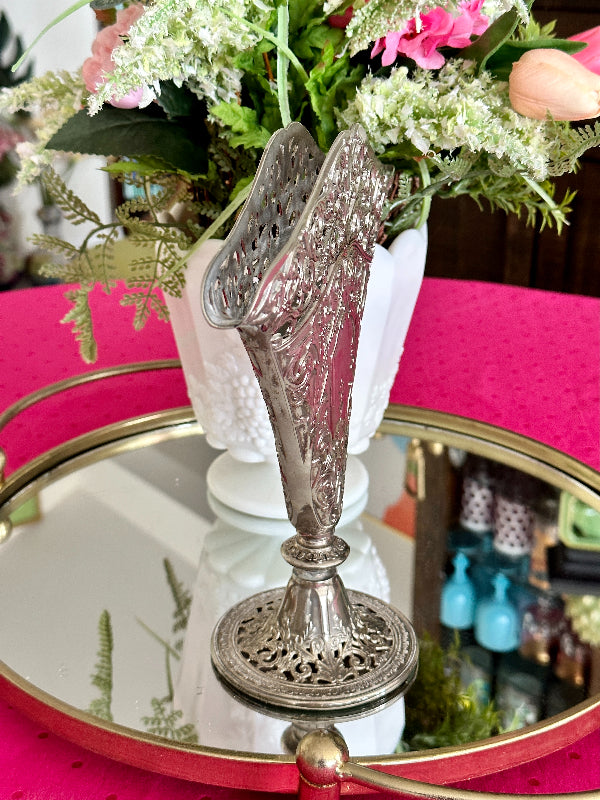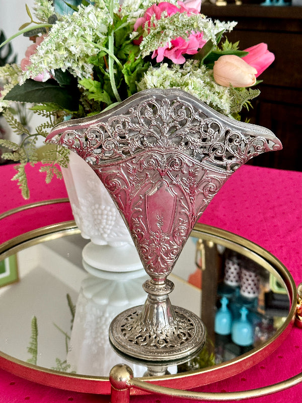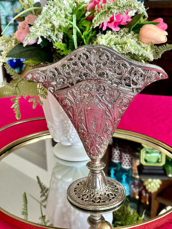 This vase is extra special! Amazing detailed scrollwork and embossing makes this really stand out. A pedestal base with a slim fan shape and insert for arranging flowers and keeping the water from damaging the silverplate. Makers mark on the bottom and a place to add engrave it for an extra touch. Perfect for an anniversary or wedding gift. Fill with your favorite flowers and enjoy. Amazing vintage condition.