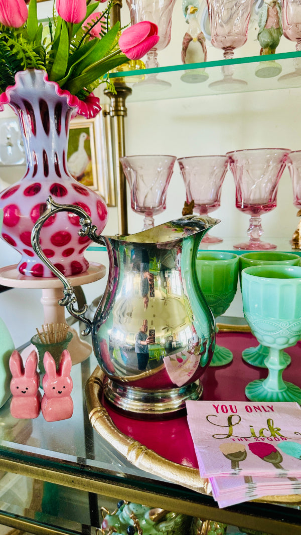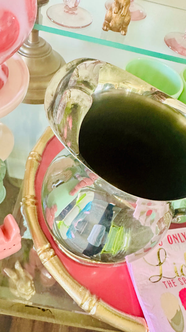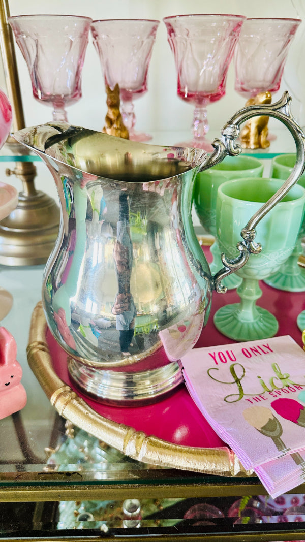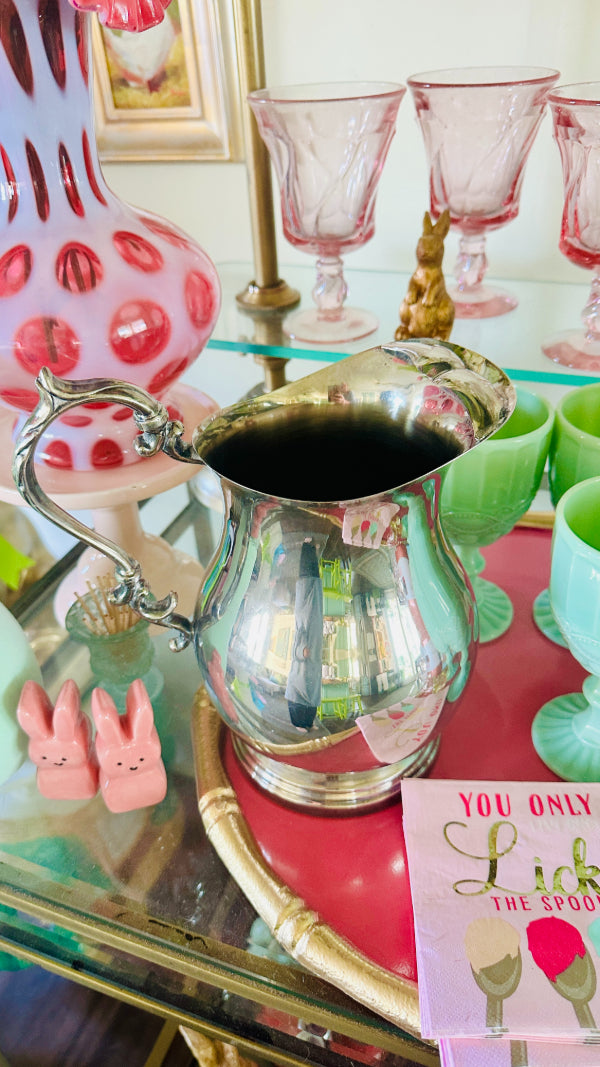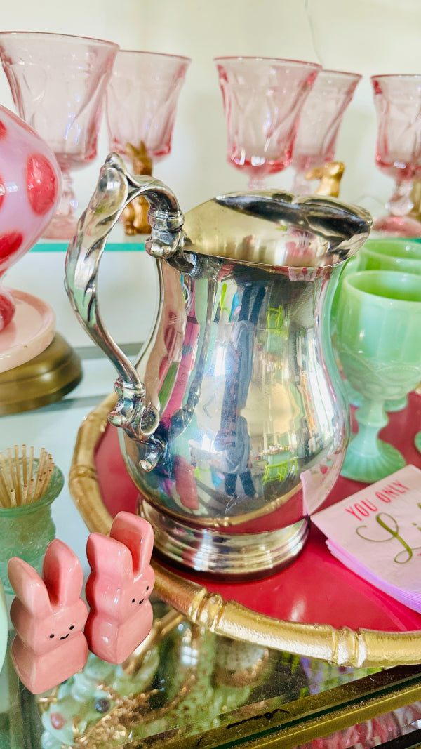 Add a touch of vintage elegance to your home with this beautifully crafted silverplate water pitcher, stamped with MRR and proudly made in the USA. Featuring a classic design with sleek curves, ornate detailing, and a graceful handle, this pitcher is perfect for both serving and display. Its high-quality craftsmanship and timeless appeal make it a standout piece in any collection or as a functional addition to your tableware. Whether used for special occasions or as a cherished vintage accent, this piece embodies the charm of American craftsmanship.