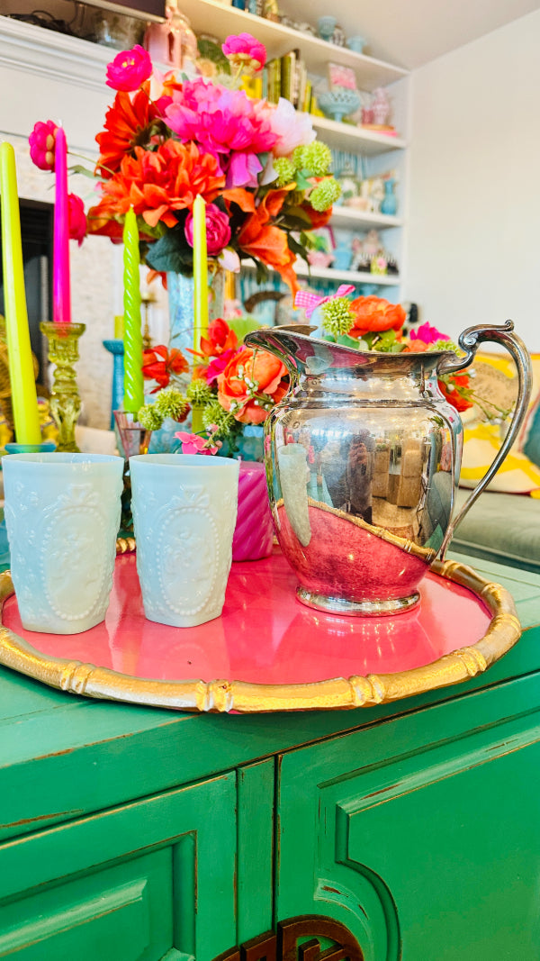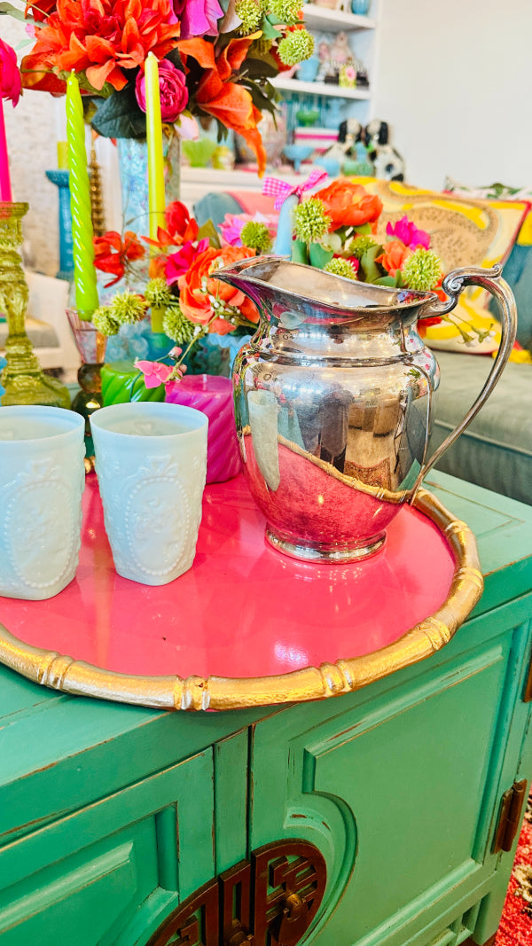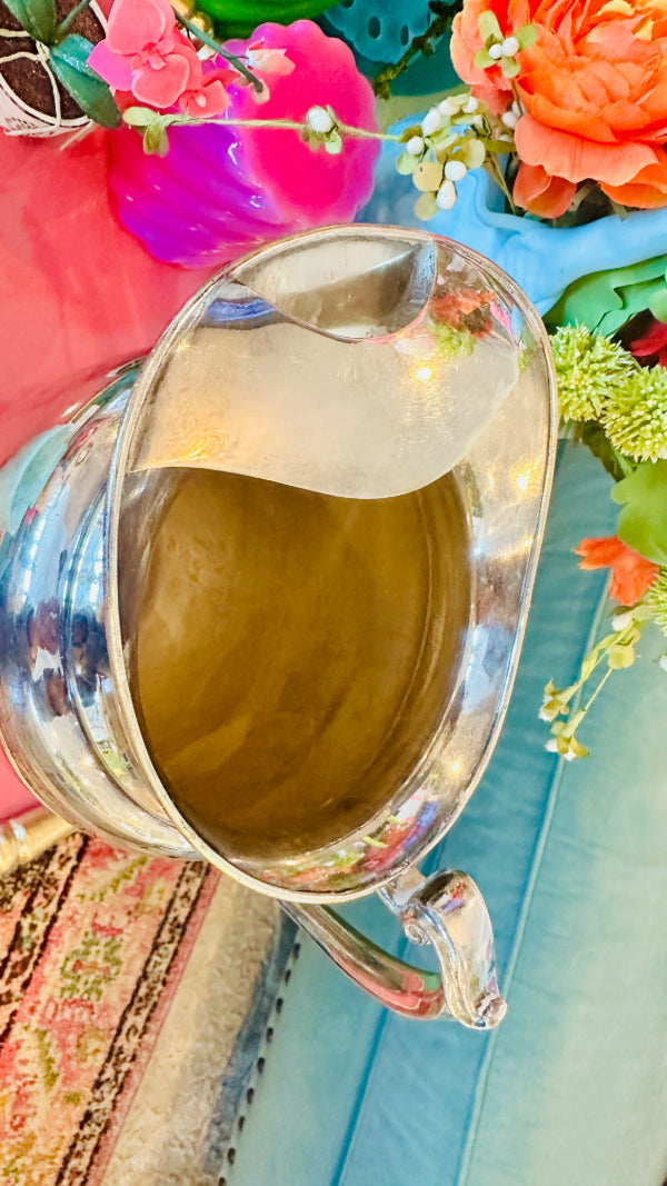 This elegant vintage silverplate water pitcher from Silvercraft, stamped 1857, exudes timeless sophistication. Crafted with attention to detail, the pitcher features a sleek, graceful shape with ornate handles and a beautifully reflective silver surface. Its classic design, combined with the historical stamp, makes it a standout piece for any collection. Whether used for serving beverages or displayed as a vintage accent, this pitcher adds a touch of history and refinement to any home. A rare and charming find for collectors and lovers of antique silverware.