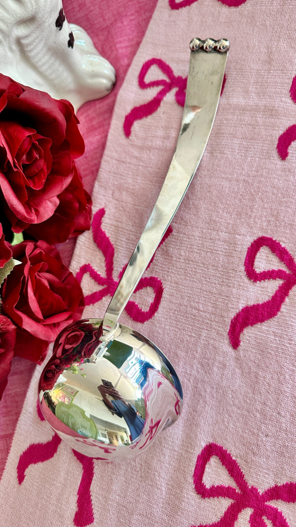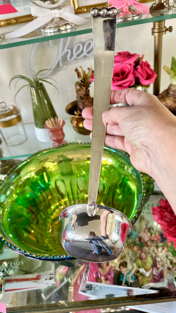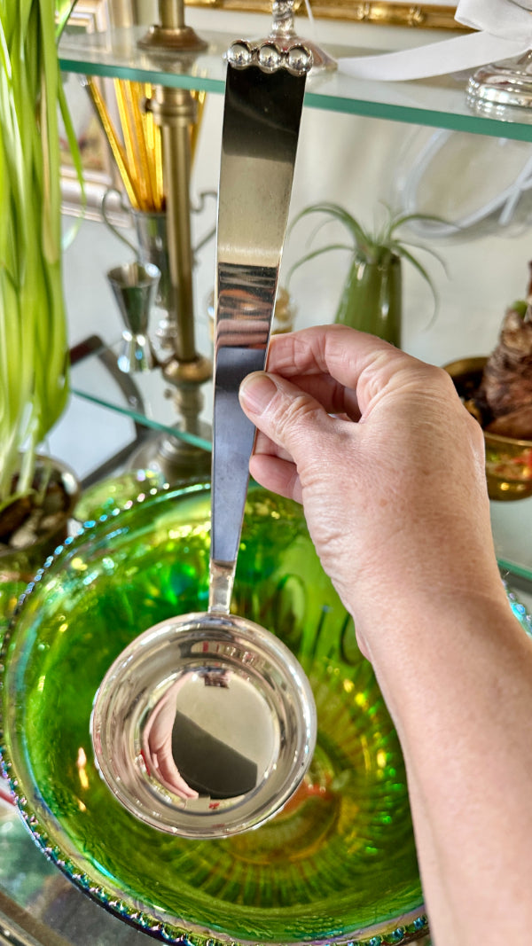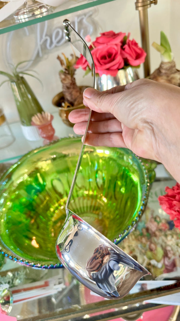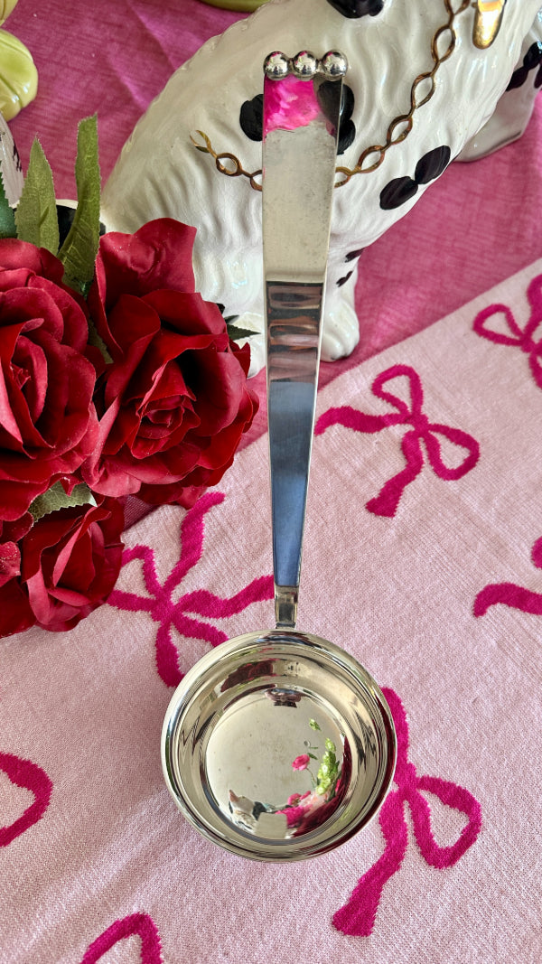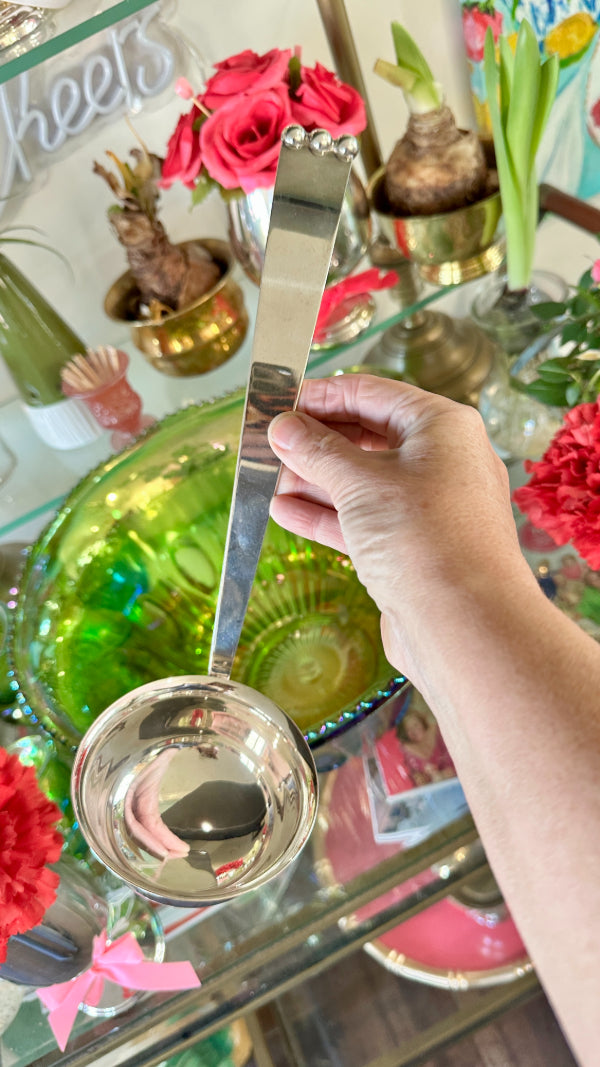 Elegant Vintage Silvertone Ladle from Saks Fifth Avenue, featuring a sleek, timeless design perfect for serving sauces, gravies, or punch. This collectible piece combines practical functionality with refined style, making it a standout addition to any vintage tableware or silverware collection. Ideal for entertaining or displaying as part of a curated vintage set.