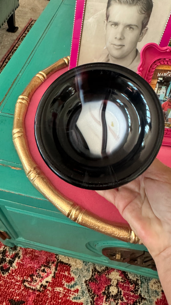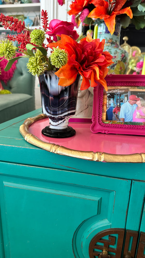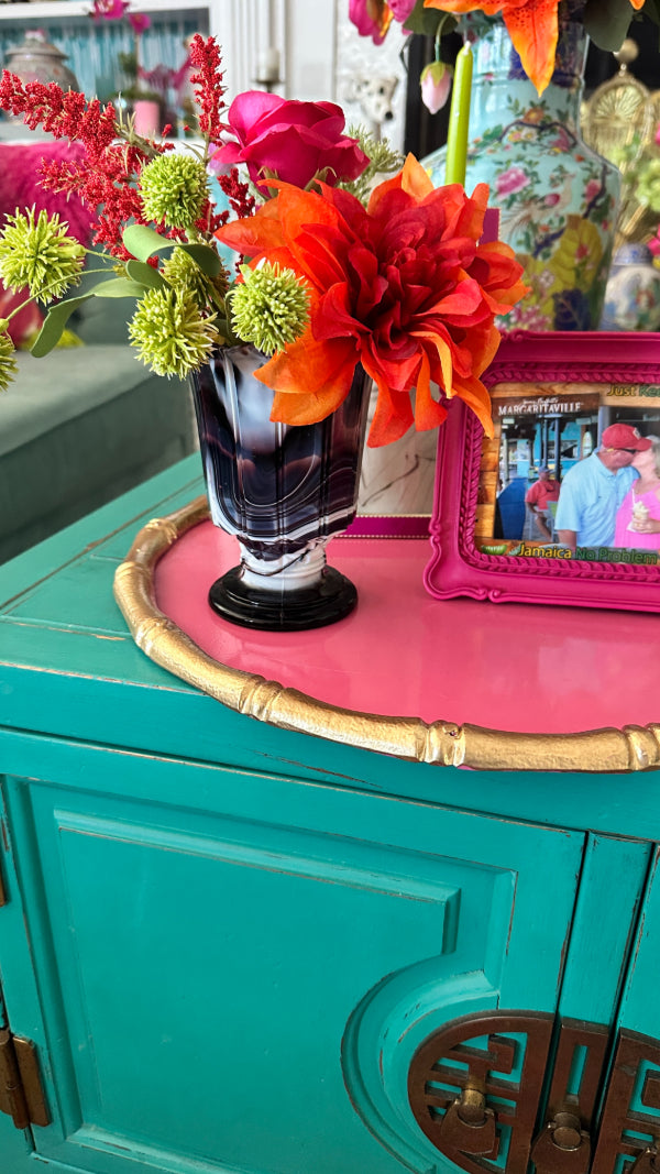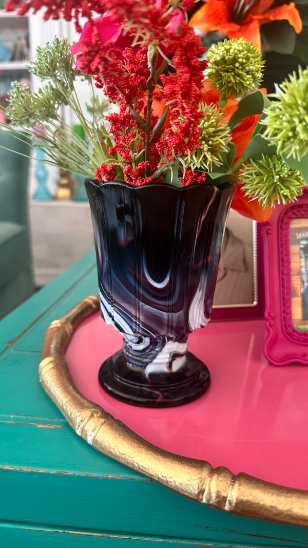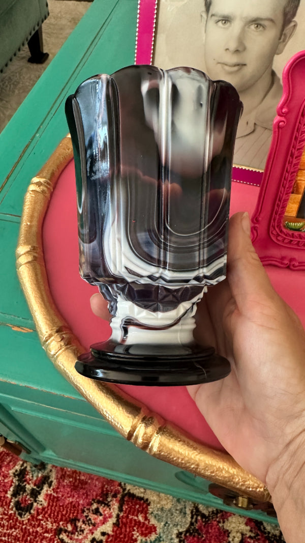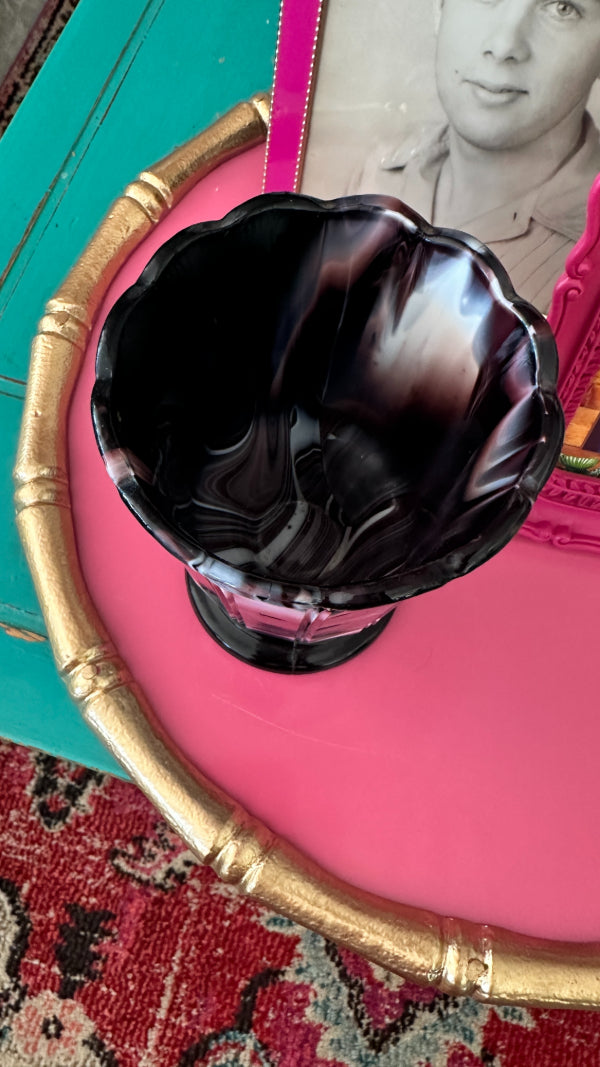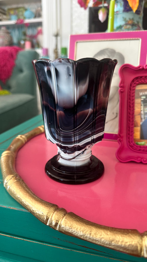 This Vintage Slag Glass Vase features a beautiful blend of purple and white tones, creating a marbled effect that highlights its unique character. Designed with an elegant scalloped edge and pedestal base, it makes a striking display piece for collectors and décor enthusiasts alike. A timeless example of early 20th-century craftsmanship, this vase brings both charm and sophistication to any setting.