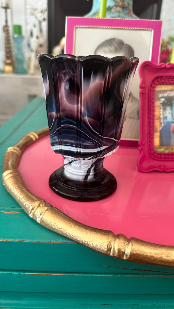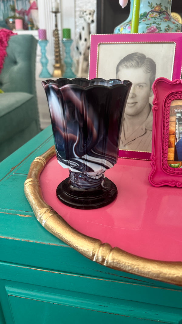 Vintage Slag Glass Vase, Purple & White, Scallop Edge, Pedestal