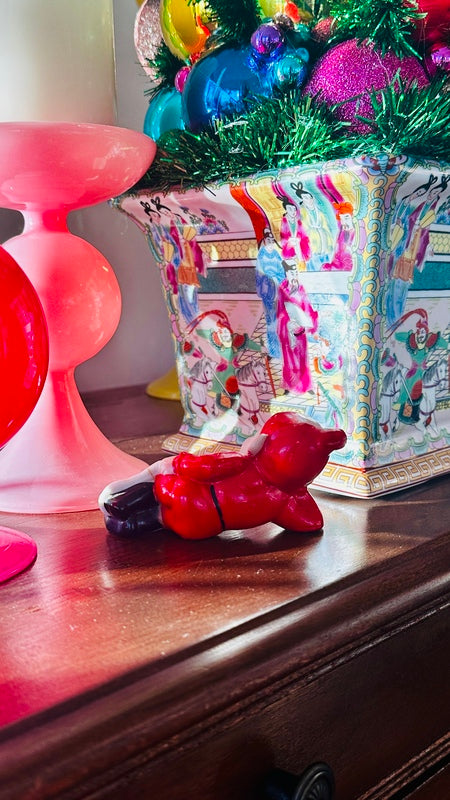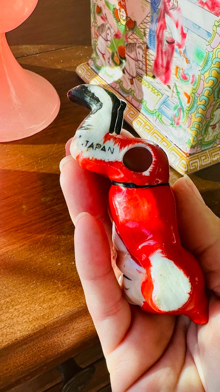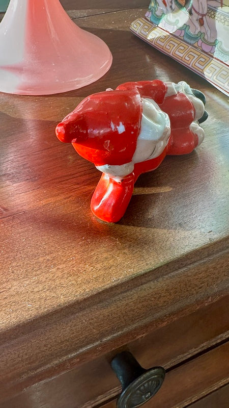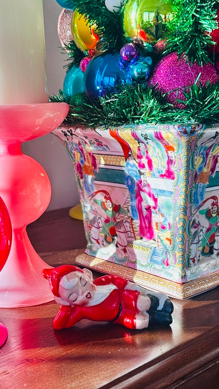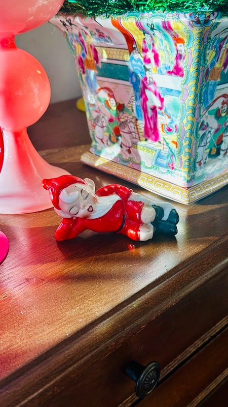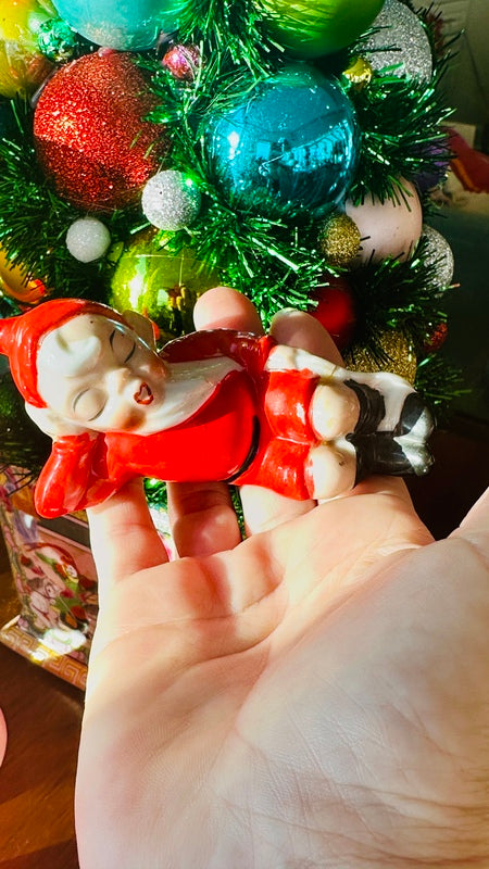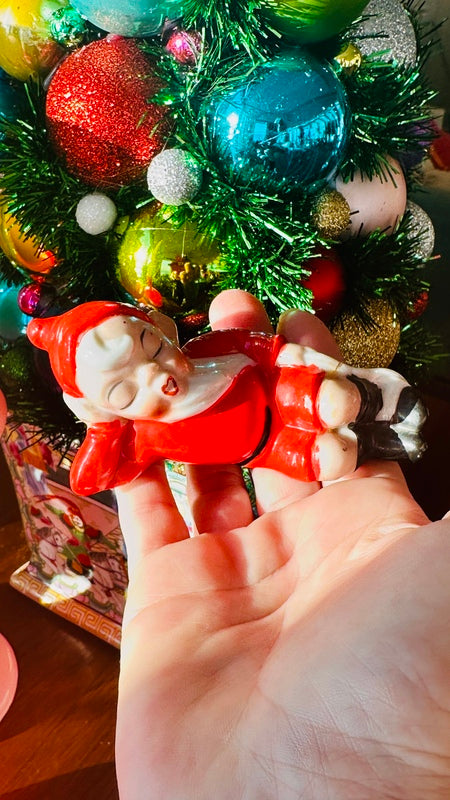 Capture the charm of the holiday season with this Vintage Sleeping Elf, crafted in fine porcelain and made in Japan. This whimsical piece features intricate detailing and a serene sleeping pose, making it a delightful addition to your festive decor or a unique collectible. Its vintage craftsmanship adds a touch of nostalgia and cheer to any space, perfect for holiday displays or as a special gift. Slight paint wear that is typical with age.