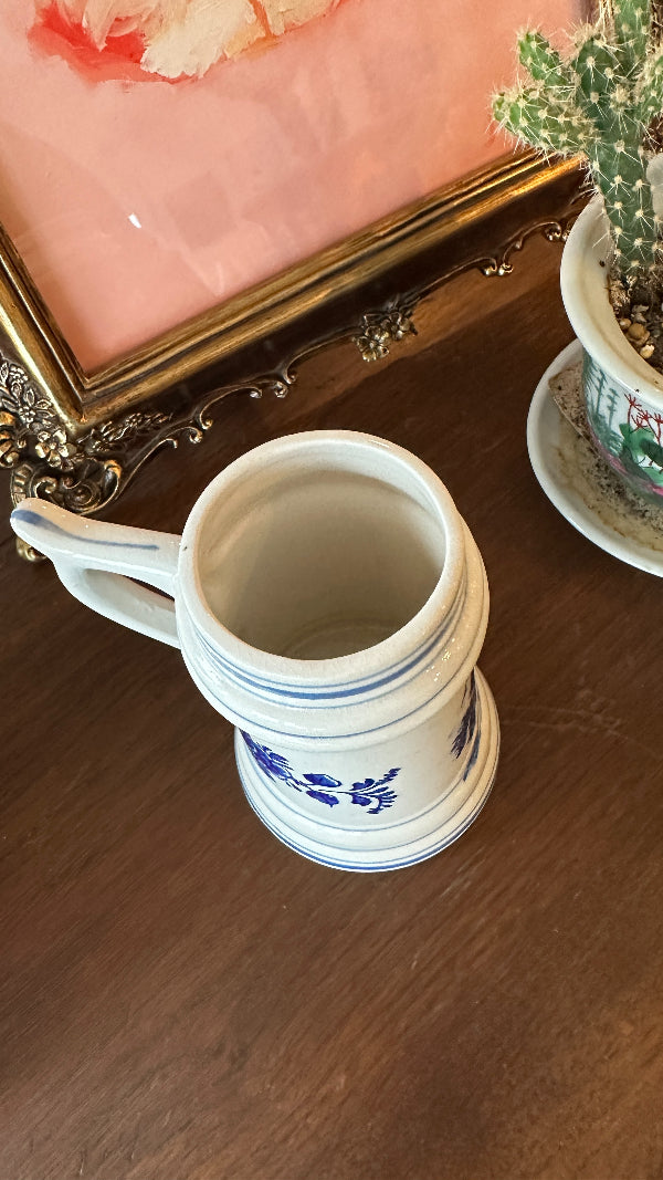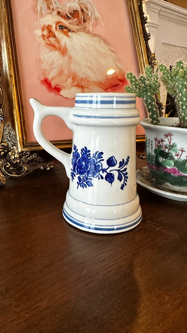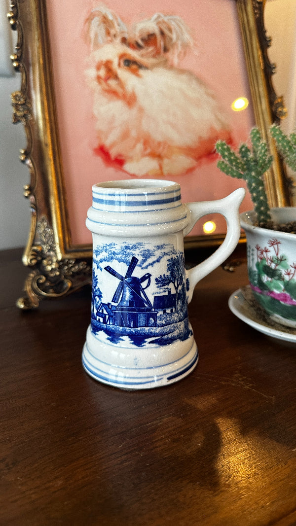 Small Vintage Stein featuring a captivating blue and white Delft design with a picturesque porcelain windmill motif. Crafted with precision and elegance, this charming piece embodies the rich tradition of Delftware pottery, originating from the historic city of Delft in the Netherlands. Add a touch of European charm to your home decor, this small stein combines beauty with functionality.