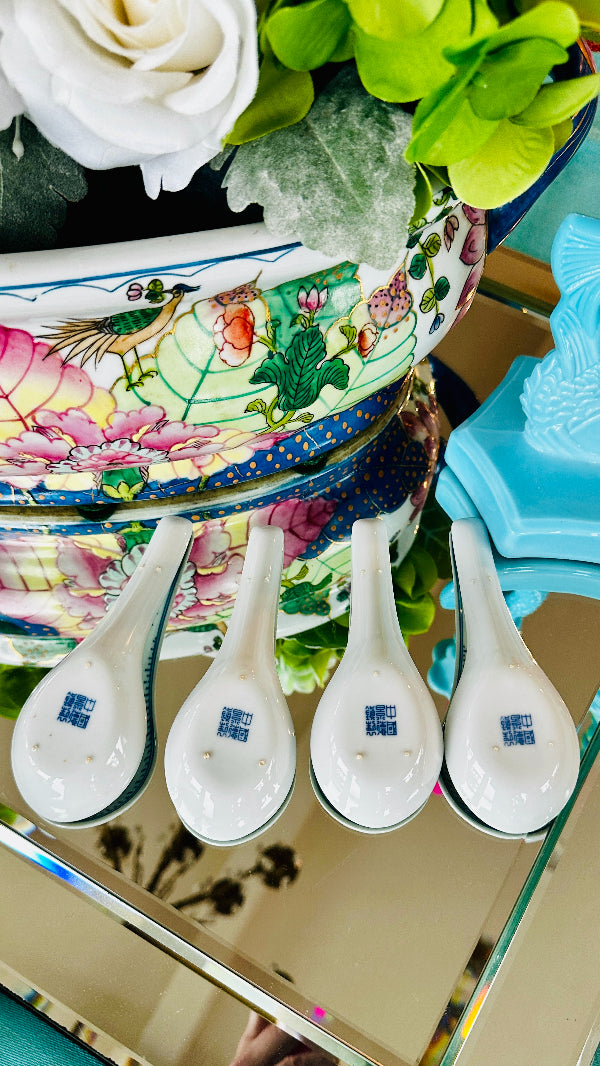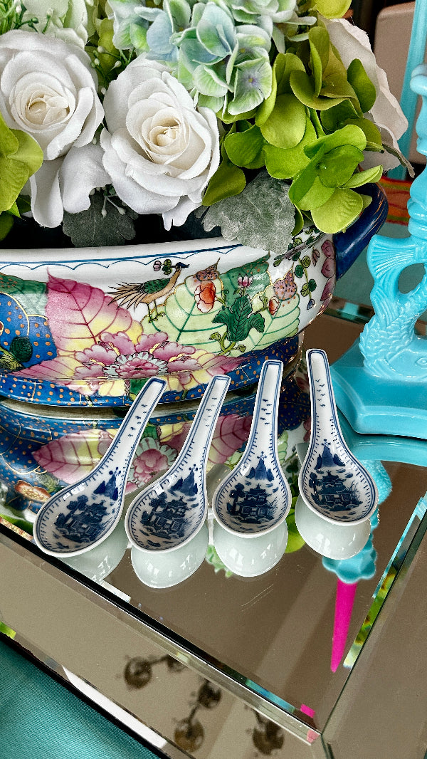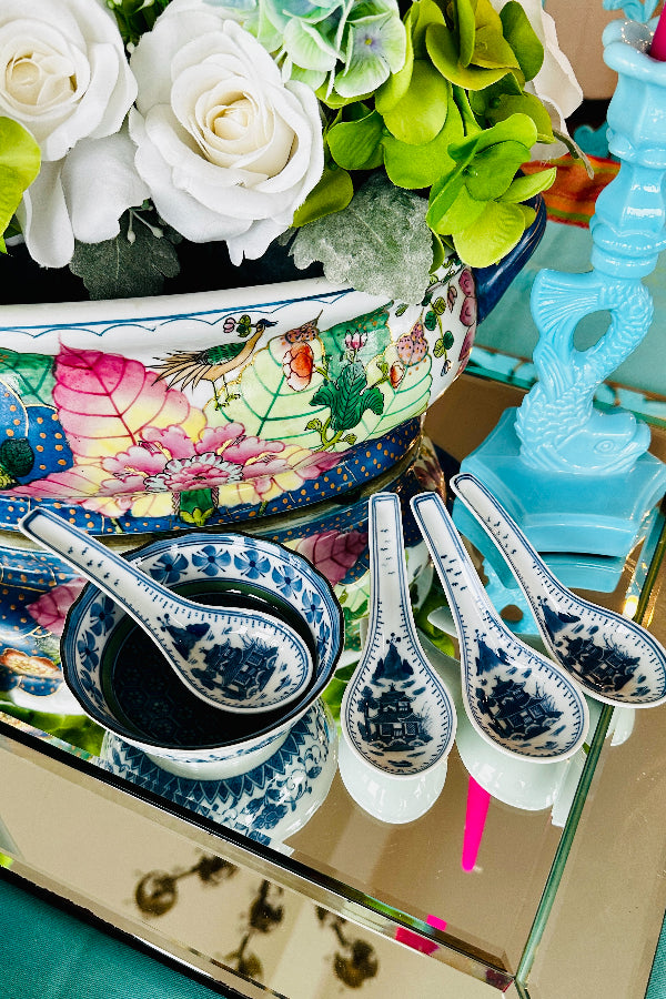Vintage Soup Spoon, featuring exquisite porcelain craftsmanship with an Asian-inspired blue and white Chinoiserie design. Each spoon is adorned with a charming pagoda motif, adding a touch of timeless elegance to your table setting. Perfect for serving rice, soups, stews, or desserts, this set combines functionality with artistic flair. Grab these spoons with a set of our rice bowls for the perfect combination.