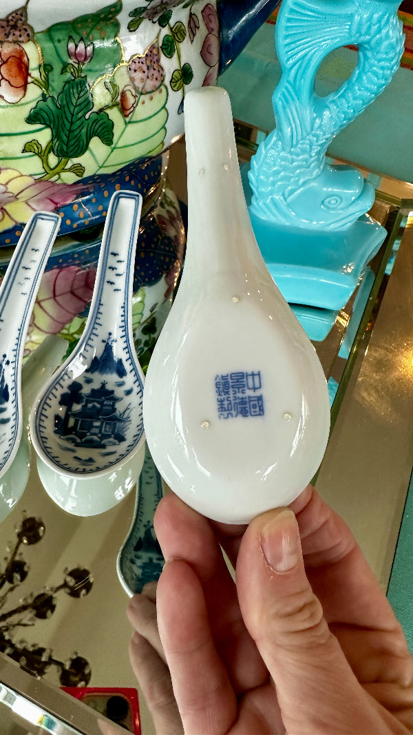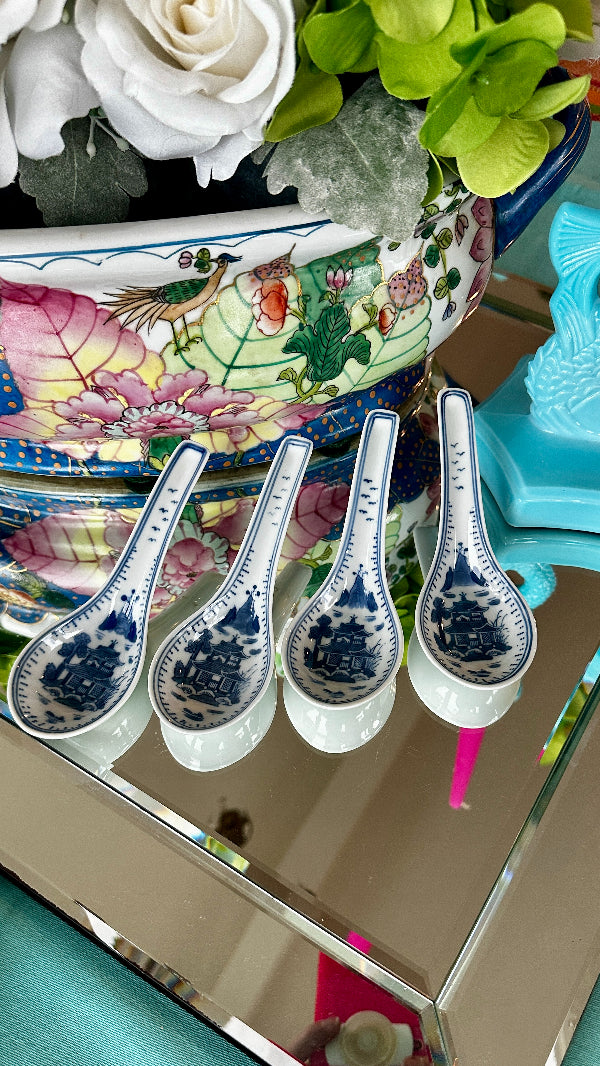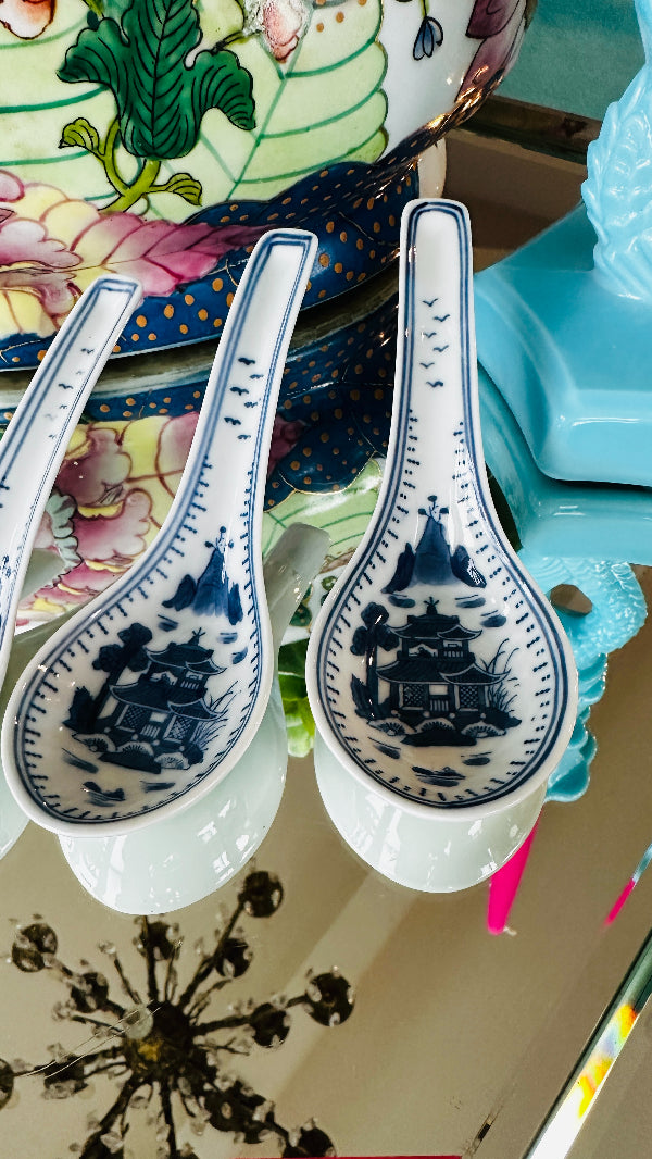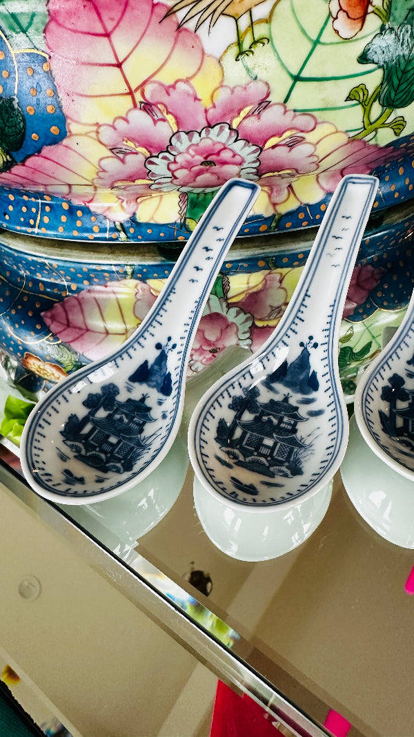 Vintage Soup Spoons, Porcelain, Asian, Blue and White Chinoiserie, Pagoda Motif SOLD INDIVIDUALLY
