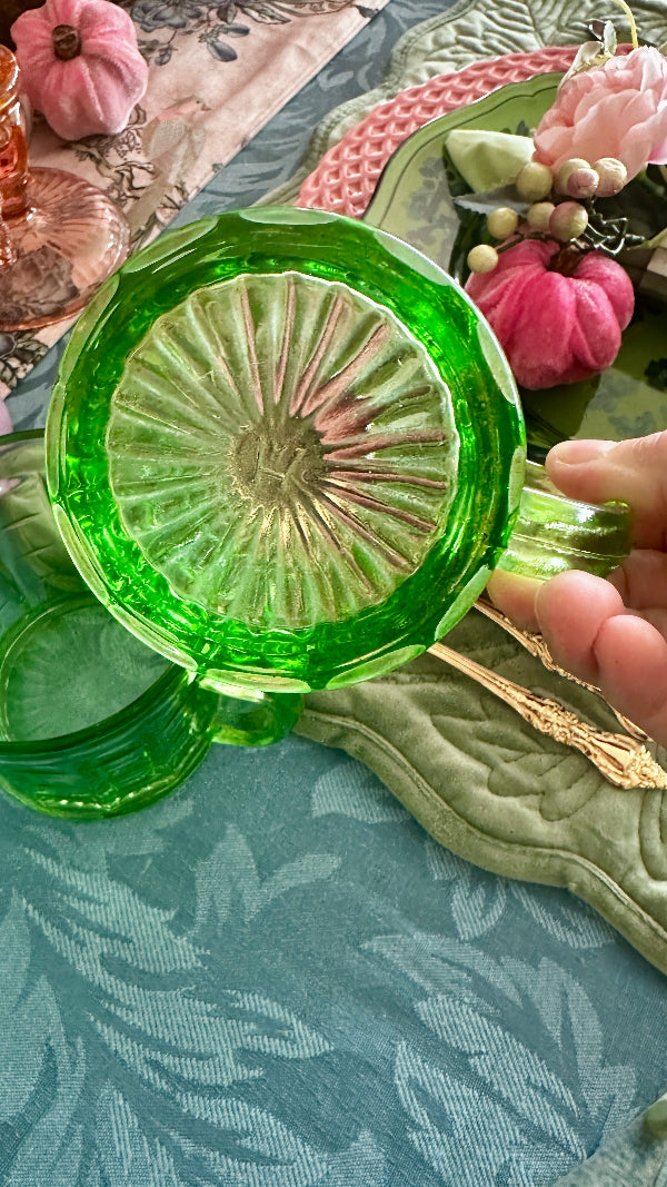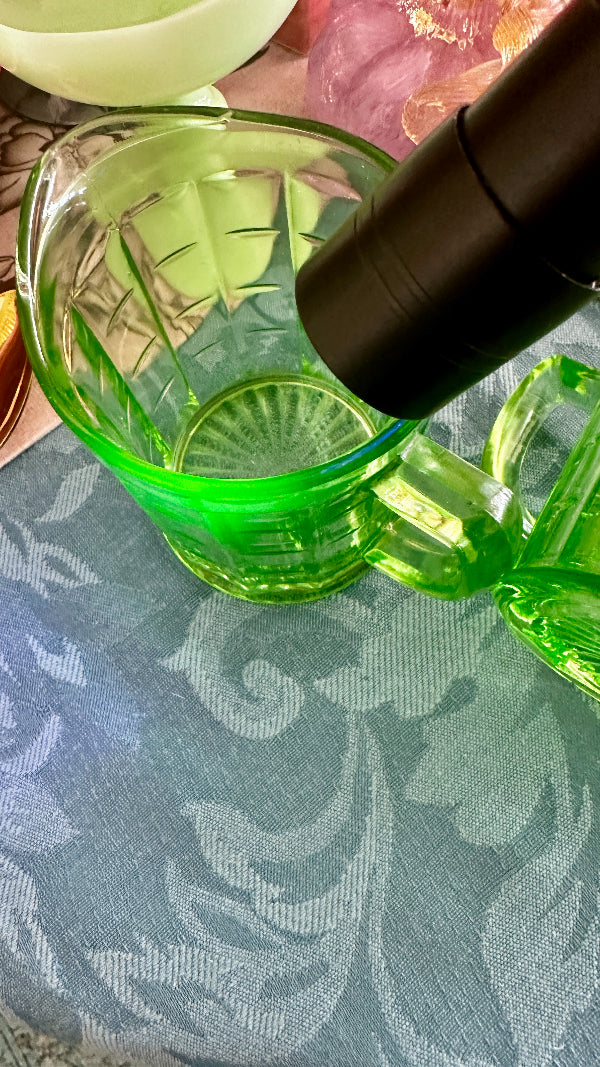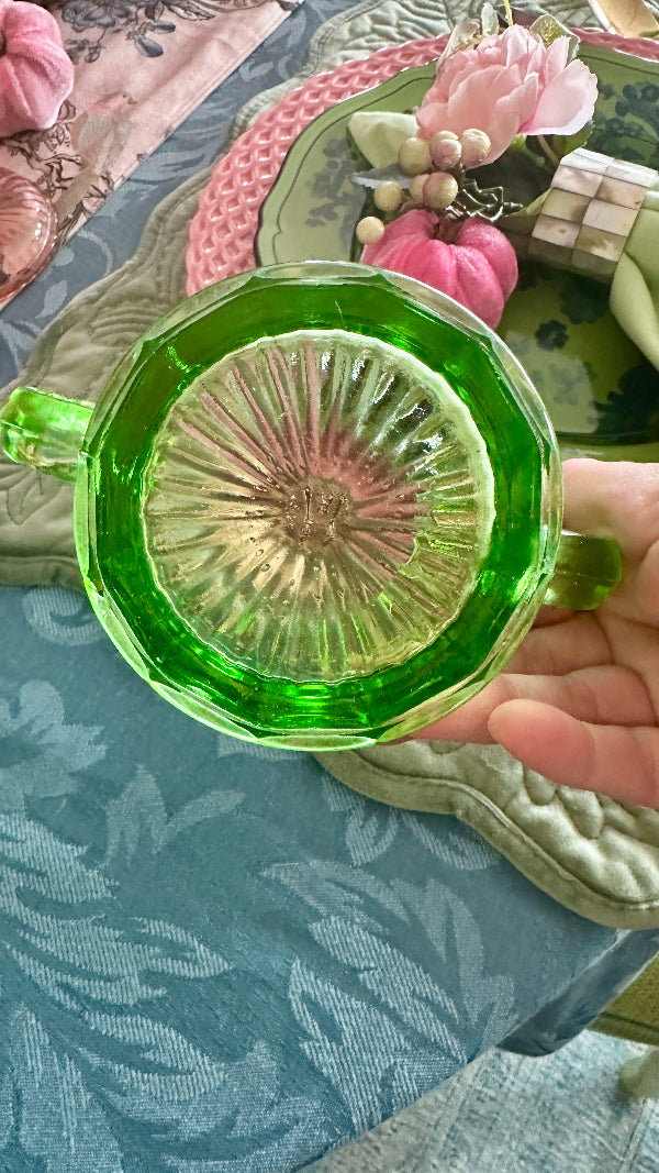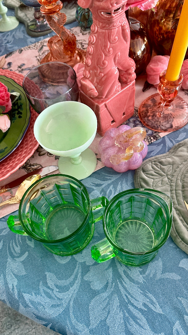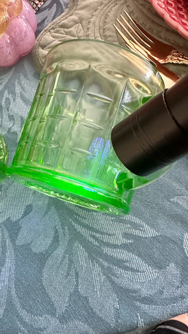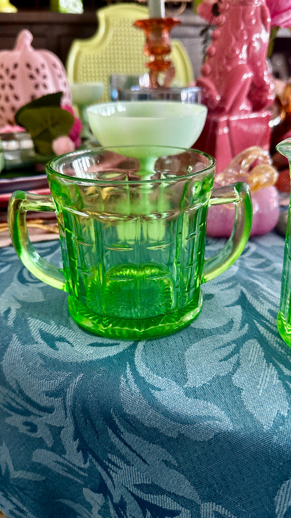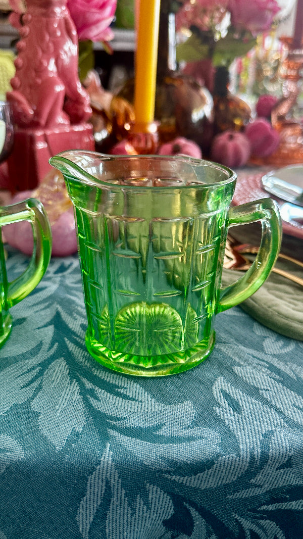 Elevate your tea or coffee service with this Vintage Sugar and Creamer Set from Hazel Atlas, crafted in striking Uranium Glass. Featuring a captivating glow under UV light, this set combines retro elegance with functional design. This Vintage Sugar and Creamer Set in Uranium Glass is perfect for adding a unique touch to your table setting, it’s a beautiful blend of vintage charm and practicality.