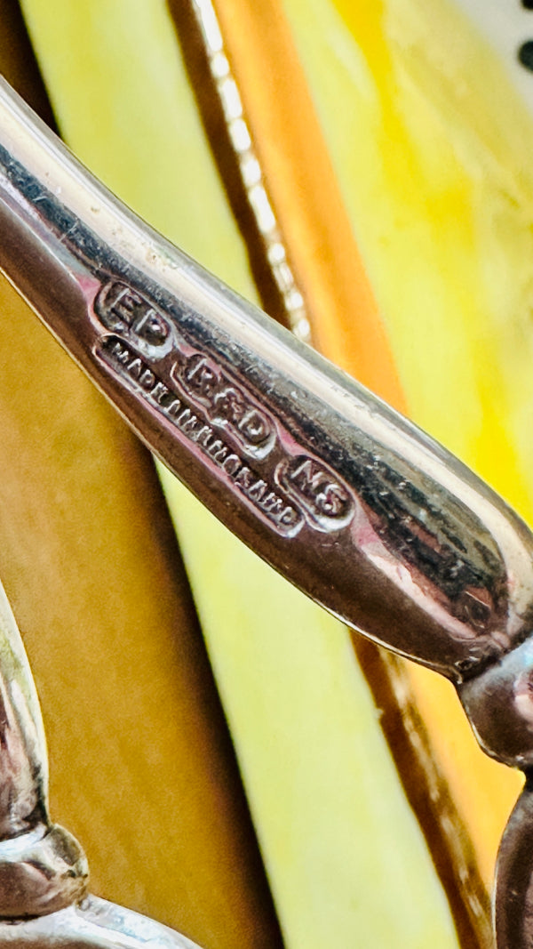 Beautiful Vintage Cake or Pastry Tongs crafted in silverplate with EP (electroplated) and NS (nickel silver) hallmarks. These classic serving tongs feature elegant detailing and timeless design, perfect for entertaining, afternoon tea, or adding a touch of antique charm to your tableware collection. A lovely choice for collectors of vintage silverplate or anyone who appreciates refined, traditional serveware.