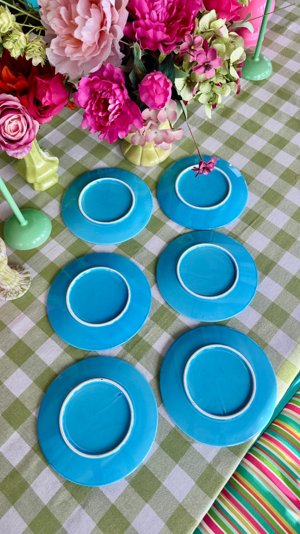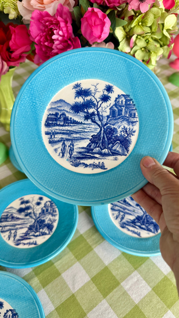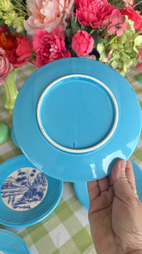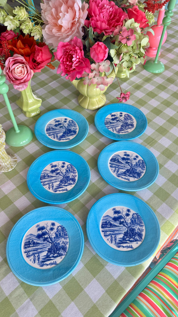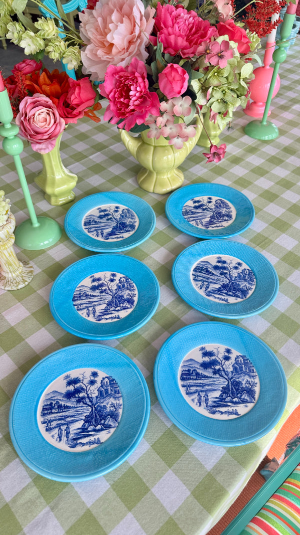 Elevate your dining experience with this elegant set of 6 vintage transferware plates, beautifully designed in classic blue and white with a bold and bright turquoise rim. Perfect for serving desserts, salads, or appetizers, these plates feature intricate, detailed patterns that reflect the charm of traditional porcelain craftsmanship. Whether you’re a collector or looking to add a touch of vintage sophistication to your table setting, this set brings timeless style and functionality to any occasion.