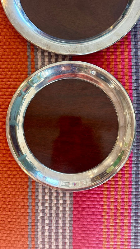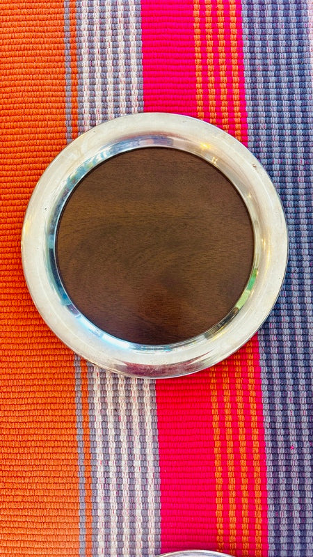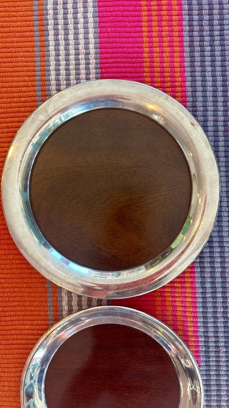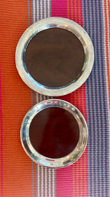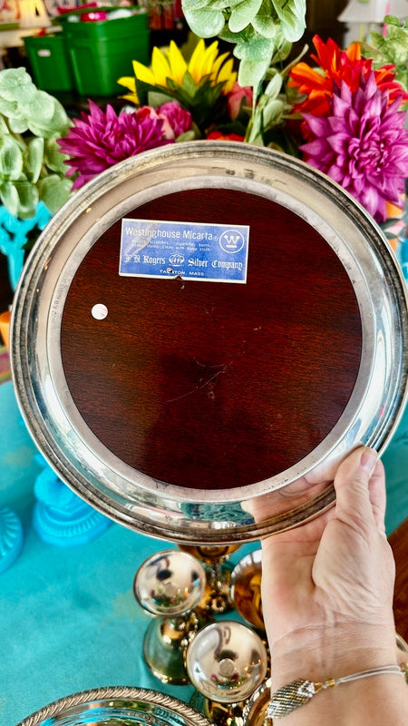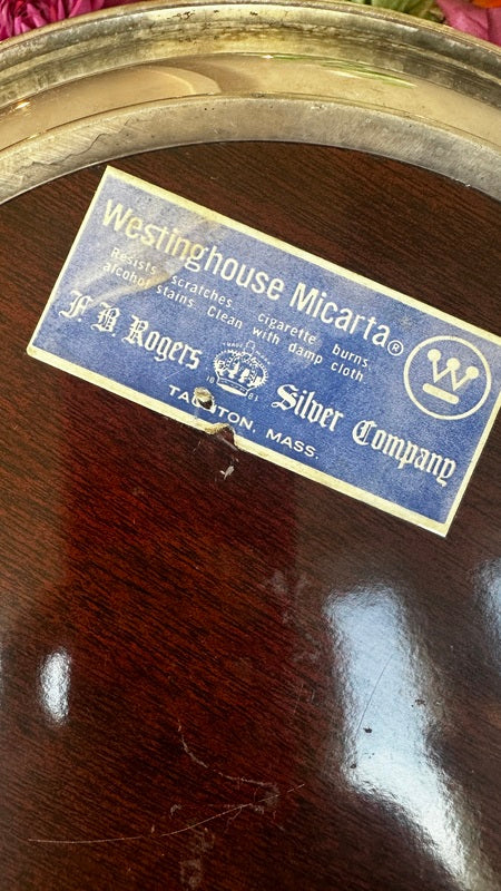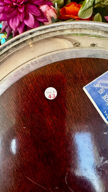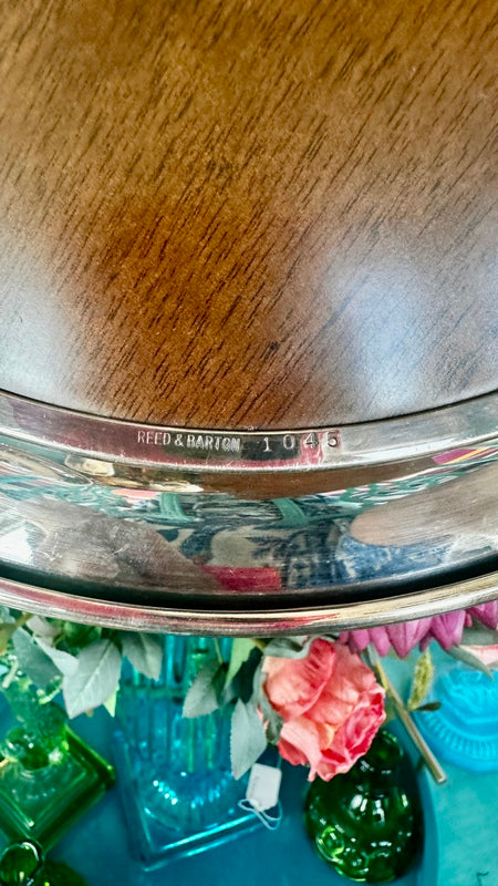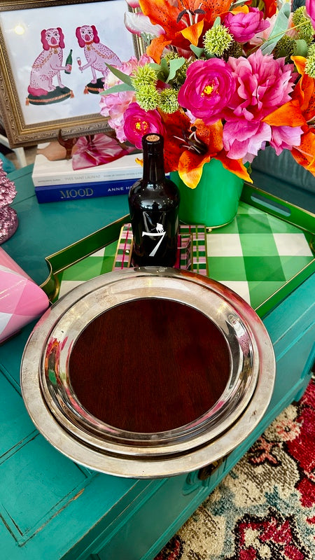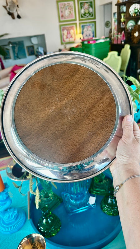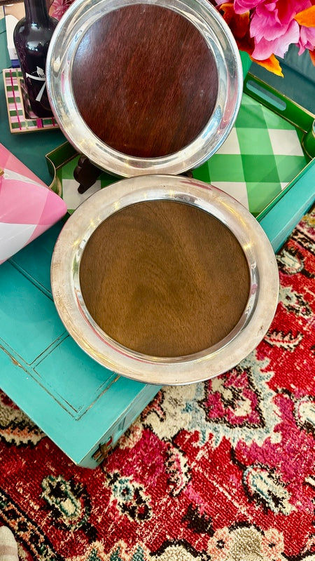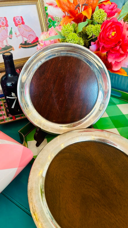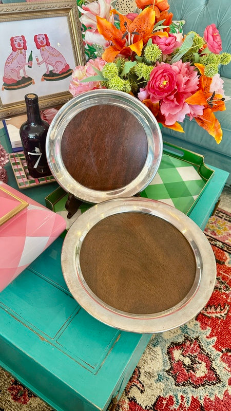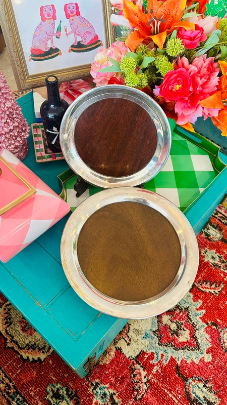 Add sophistication to your space with these Vintage Trays by FB Rogers Silver Co., featuring a beautiful combination of silverplate and woodgrain accents. Mid Century Modern style that are perfect for a bar or buffet. With two trays available, they are perfect for serving or display, offering timeless elegance and a touch of classic charm.
