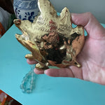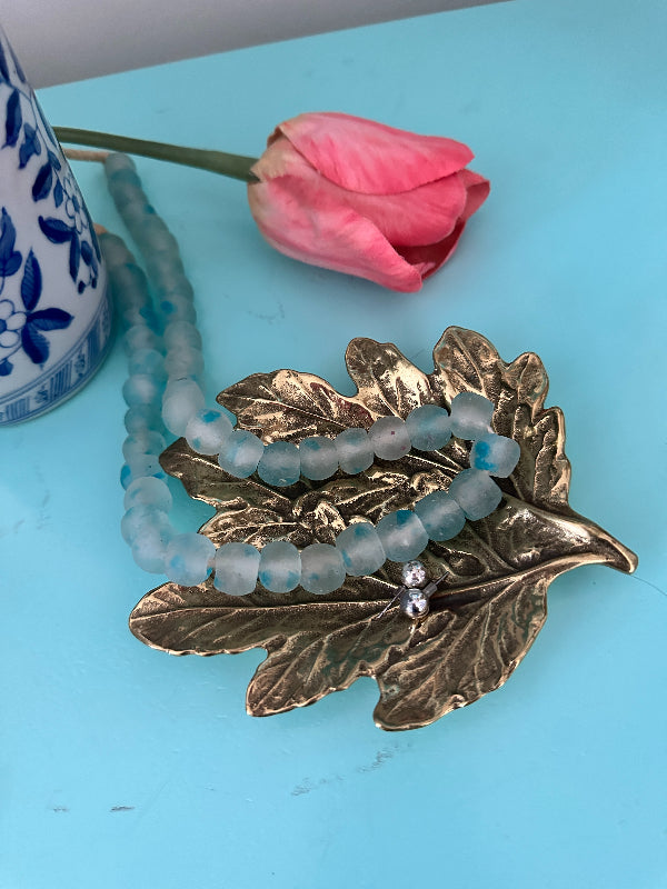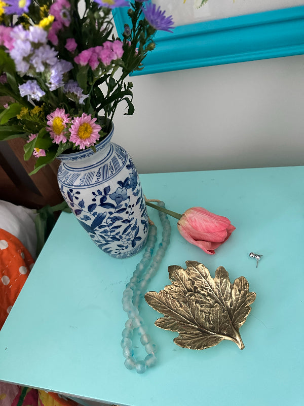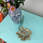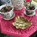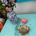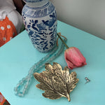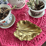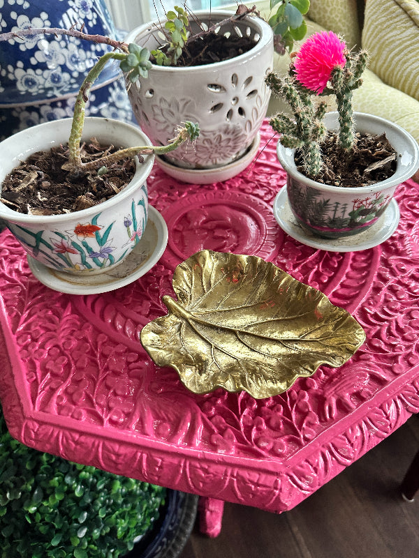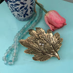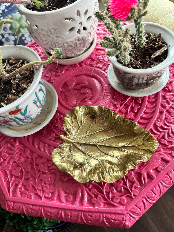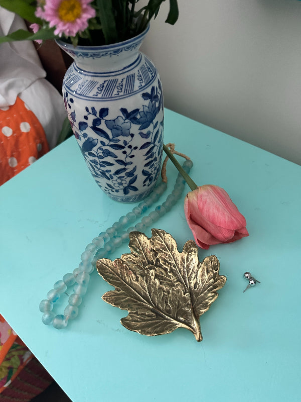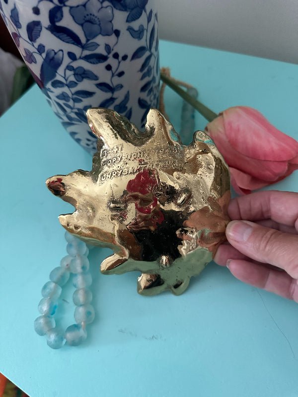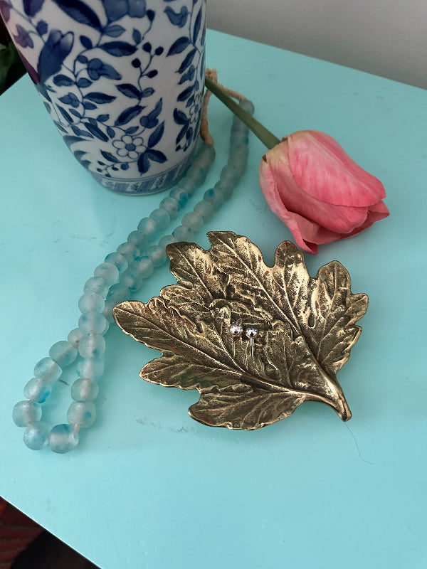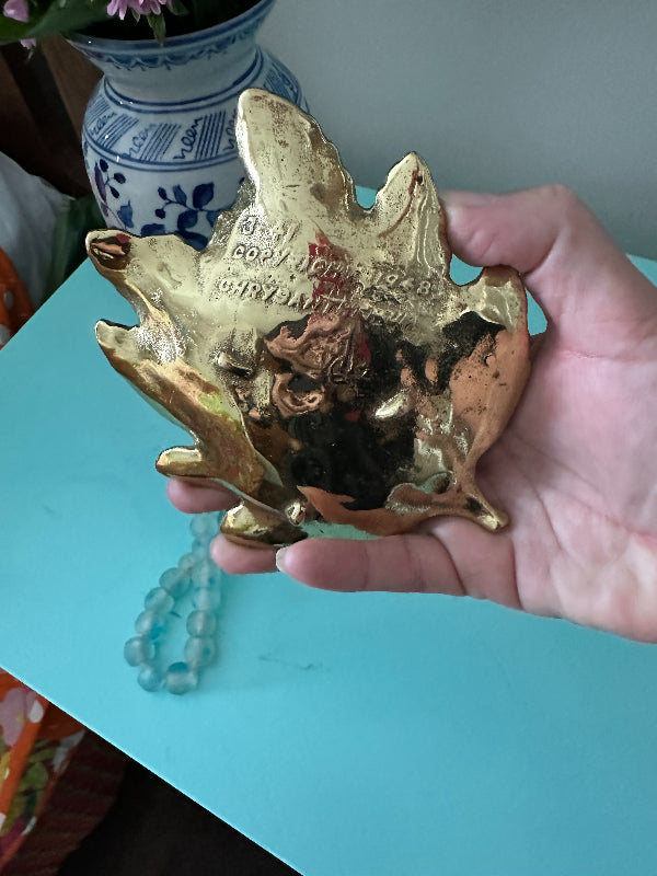 Add a shine to your side table or night stand with this gorgeous brass leaf trinket dish. Made of solid brass with a detailed vein pattern in the leaf. Nicely curled edges add interest to the shape. Perfect to hold jewelry when you go to bed, loose change, small office supplies like paper clips or safety pins. Adss a bit of sparkle and warmth to any space. Also perfect to hold a bar of soap!See picture details as they are part of the description.