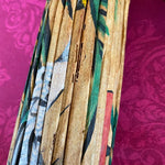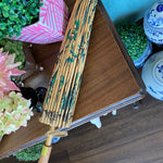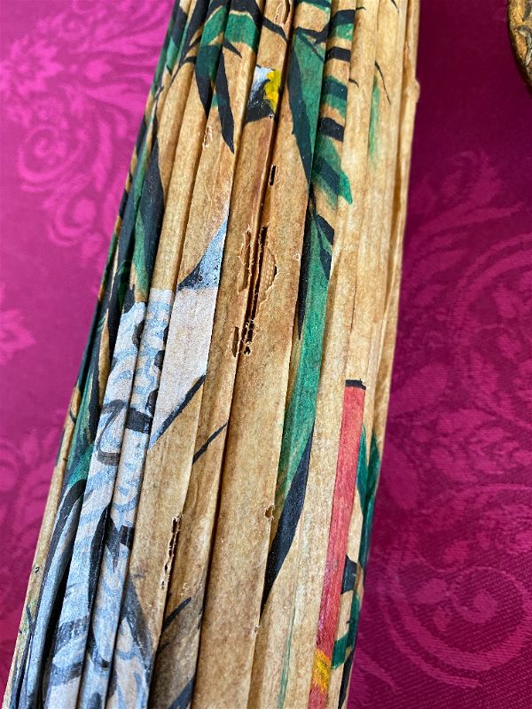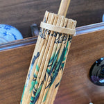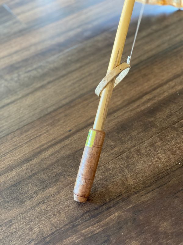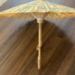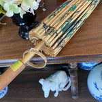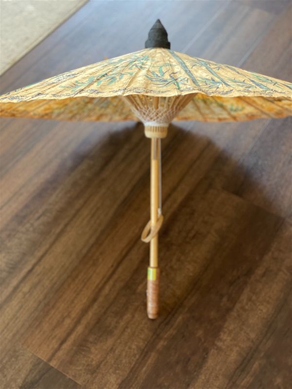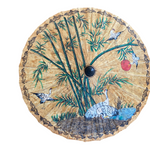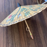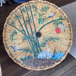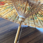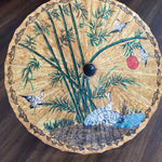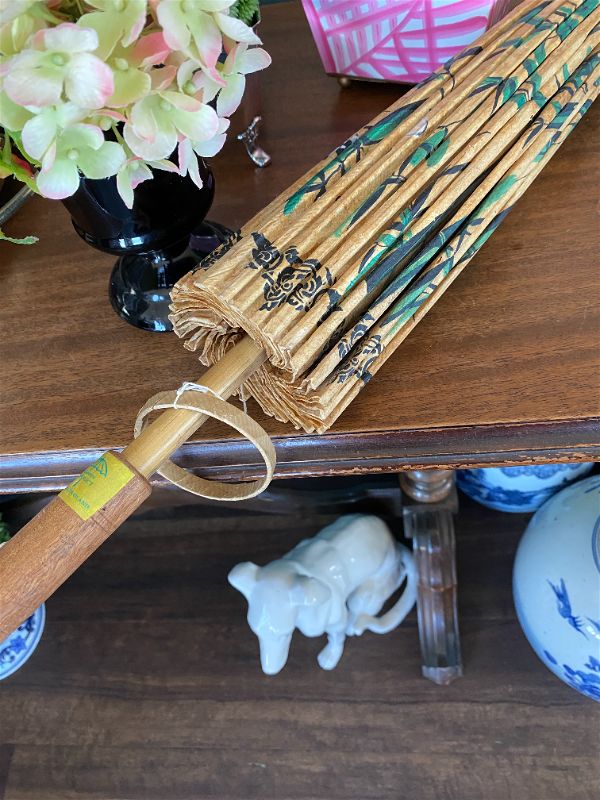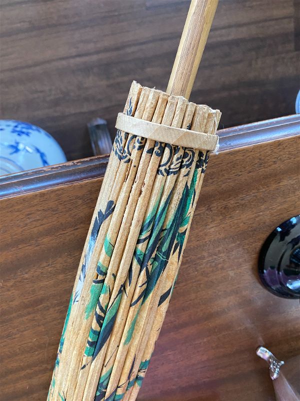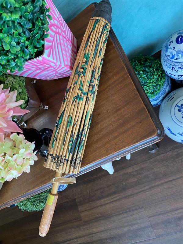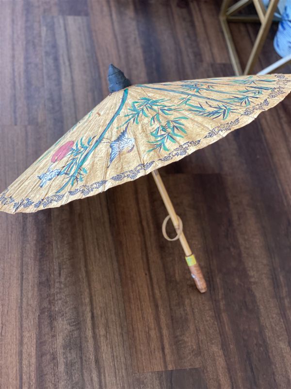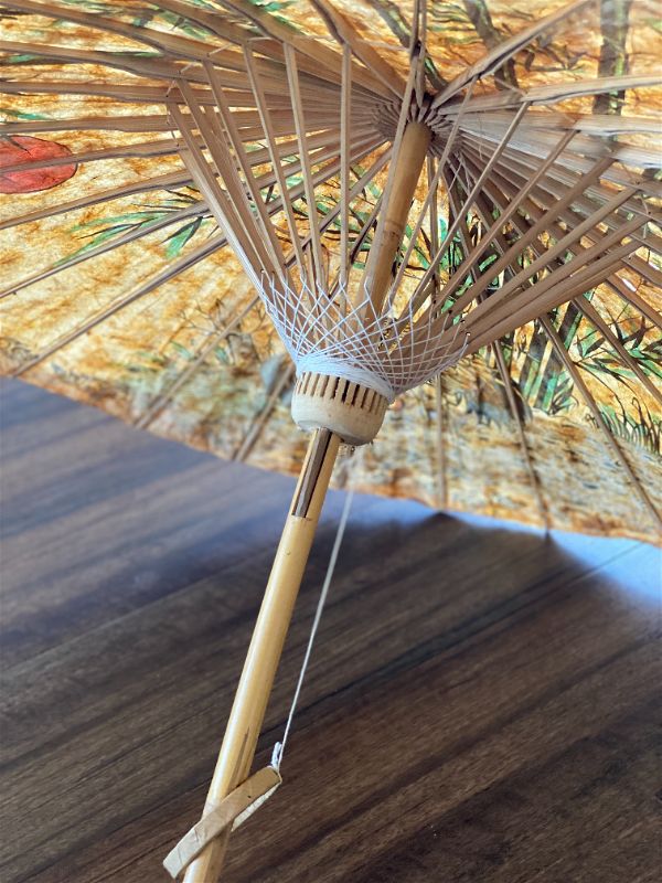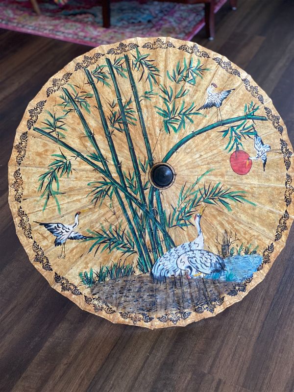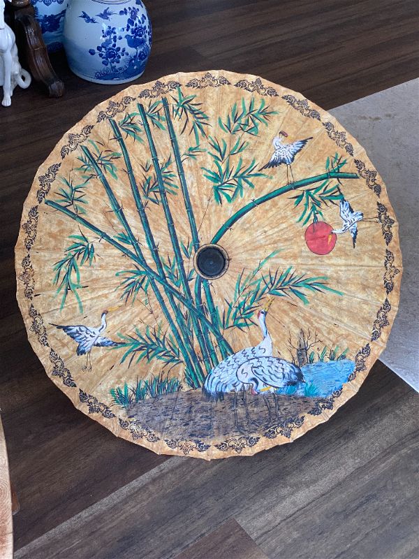This Vintage Asian rice paper and bamboo umbrella in amazing condition for it's age. The bamboo, red sun and crane motif is great to display as a rare piece of art. Umbrellas are a fun way to add color and texture to a space. Looks great hanging from a ceiling, over a child's bed, or stored in a vintage umbrella stand. Has a few small tears in the paper but doesn't detract from its function and beauty. Clip to hold it open works, strings are all intact and the wooden rails are complete. See picture details as they are part of the description.