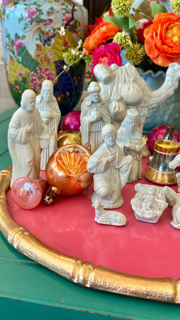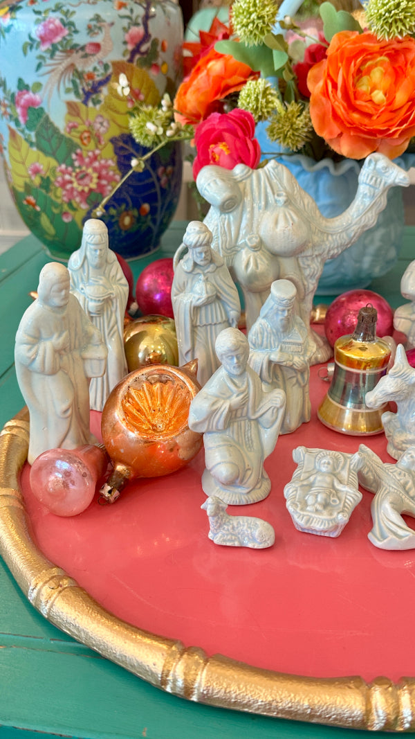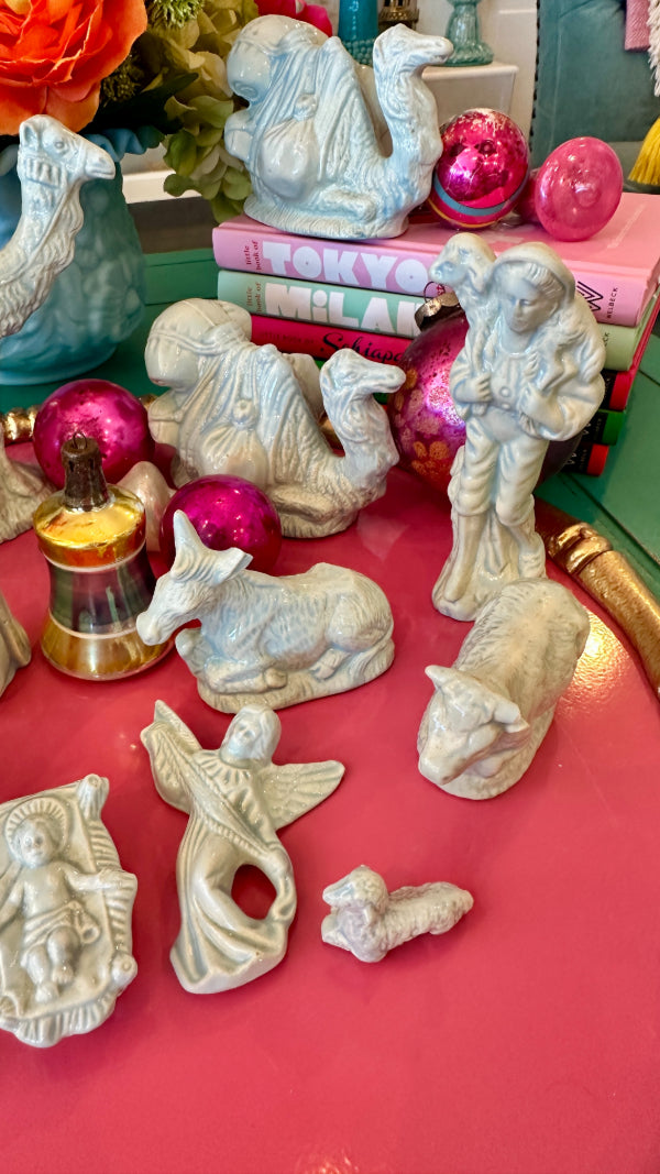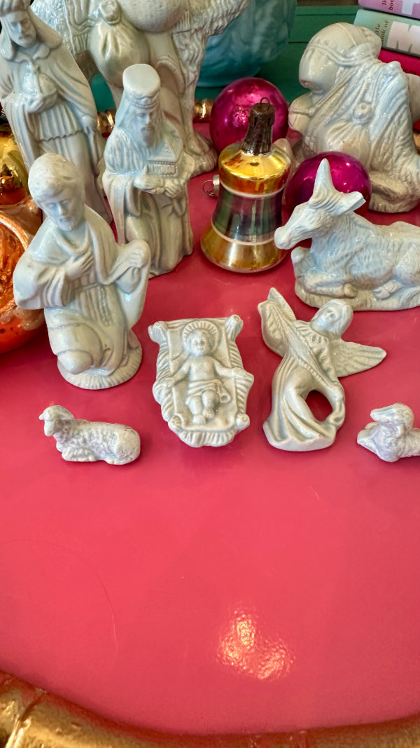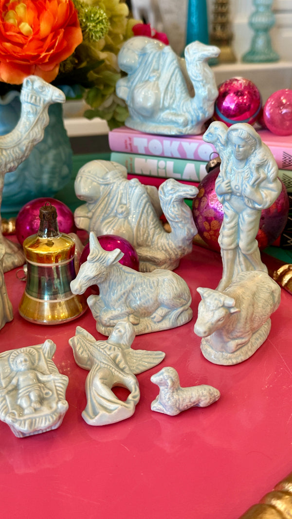 Celebrate the season with this charming Vintage Aqua Ceramic Nativity Scene, a 15-piece set featuring beautifully glazed figures in a soft aqua hue. Each piece showcases delicate mid-century craftsmanship and serene detailing, from the Wise Men and shepherds to the animals and Baby Jesus. The set is missing Mary and has one small chip on the donkey’s ear, but remains a lovely and display-worthy collection. Perfect for vintage Christmas enthusiasts, collectors of ceramic nativity sets, or anyone drawn to unique retro holiday décor with character and history. (This set is imperfect -Missing Mary, I chip on ear of donkey)