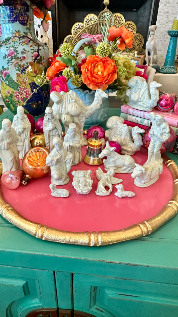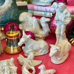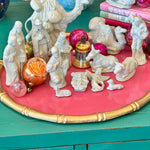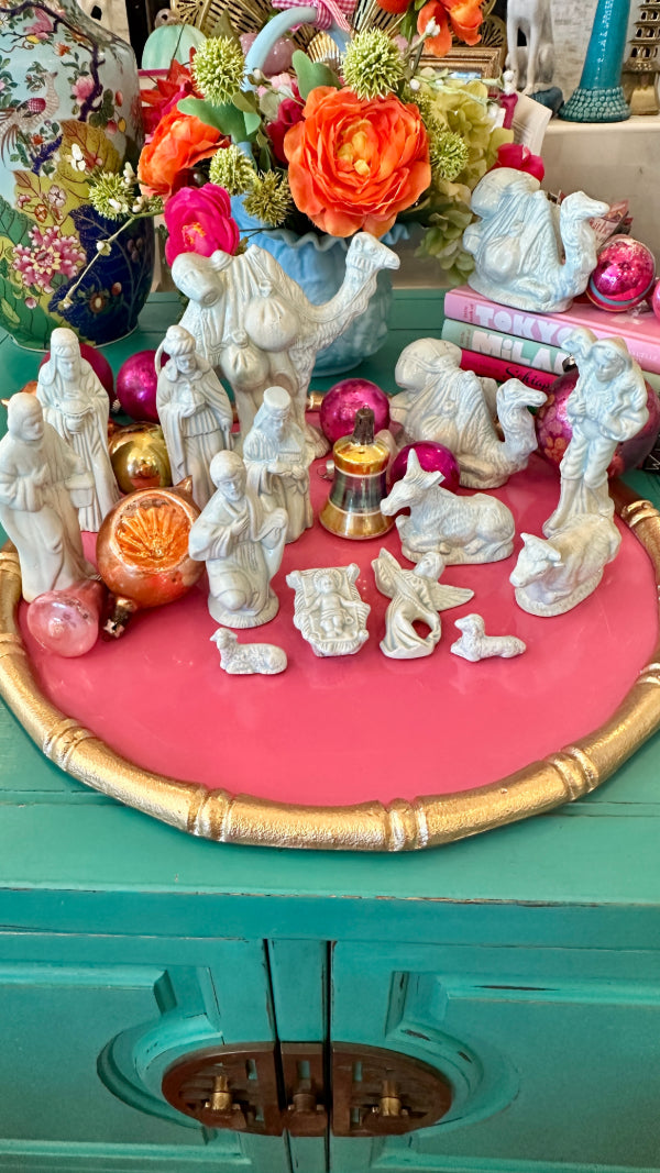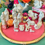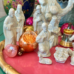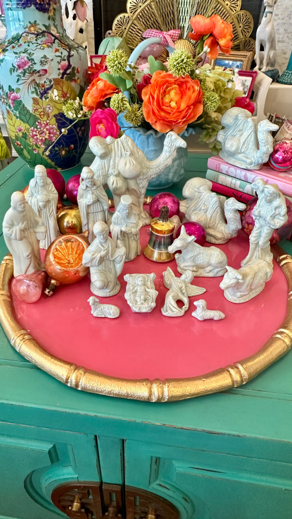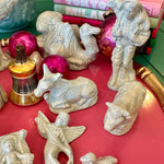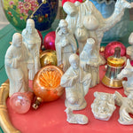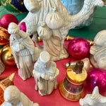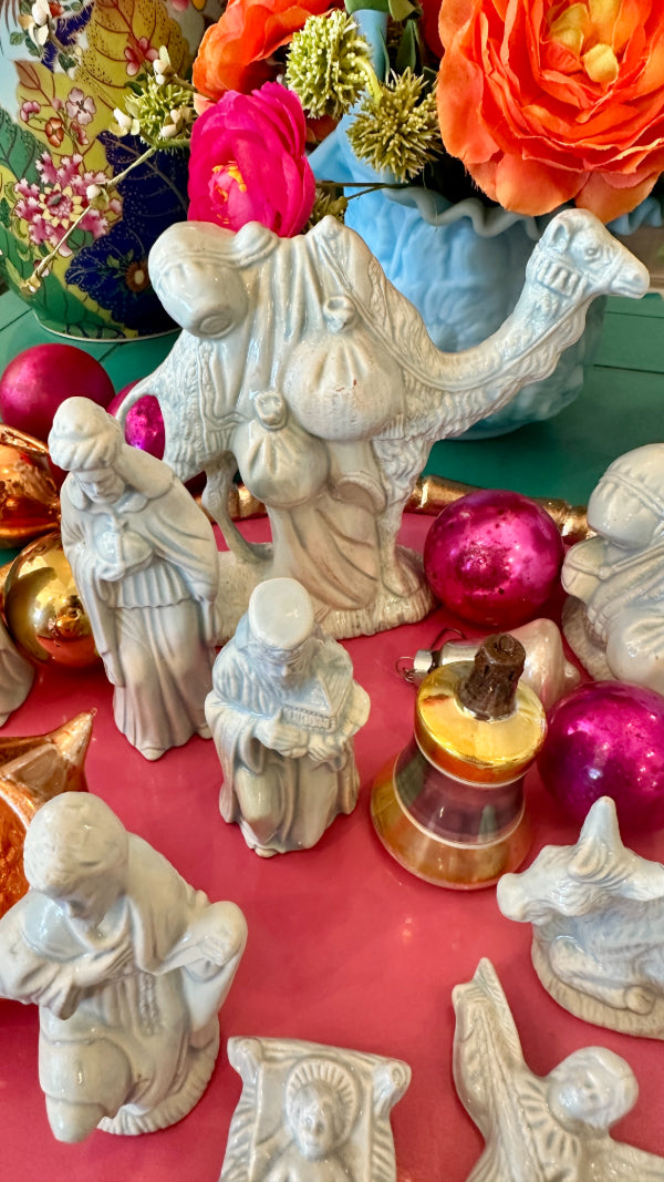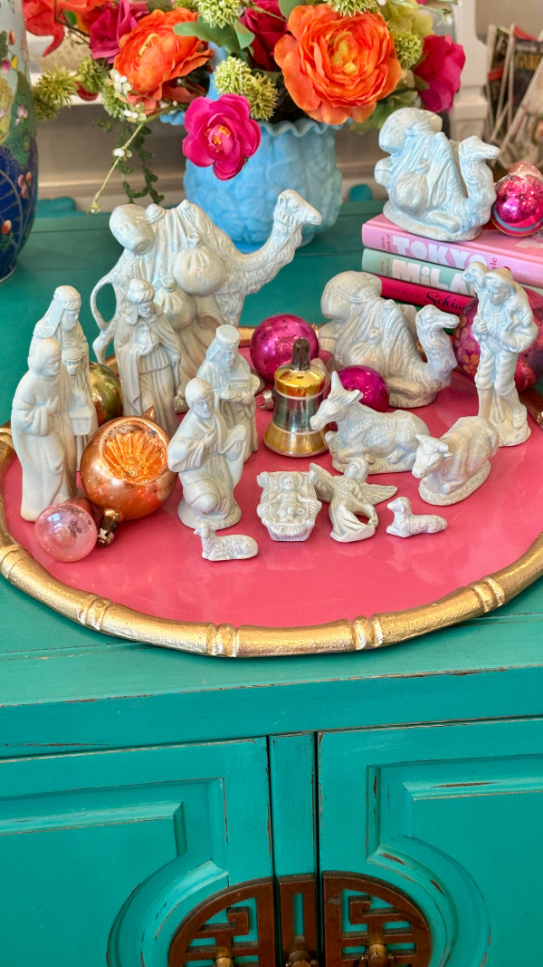 Celebrate the season with this charming Vintage Aqua Ceramic Nativity Scene, a 15-piece set featuring beautifully glazed figures in a soft aqua hue. Each piece showcases delicate mid-century craftsmanship and serene detailing, from the Wise Men and shepherds to the animals and Baby Jesus. The set is missing Mary and has one small chip on the donkey’s ear, but remains a lovely and display-worthy collection. Perfect for vintage Christmas enthusiasts, collectors of ceramic nativity sets, or anyone drawn to unique retro holiday décor with character and history. (This set is imperfect -Missing Mary, I chip on ear of donkey)