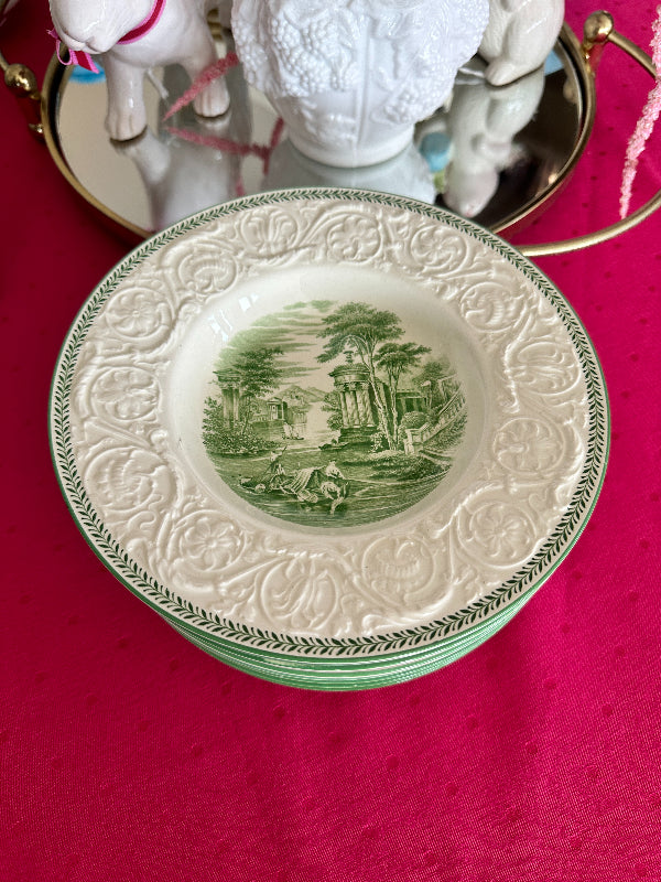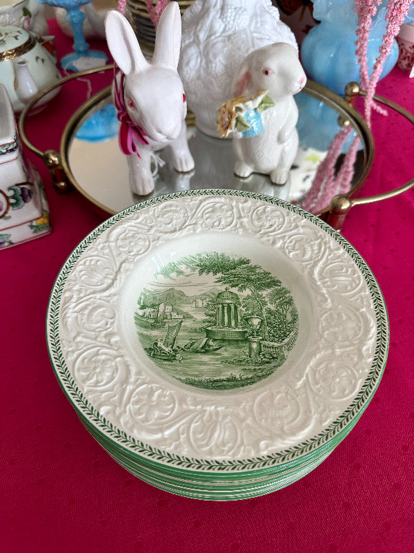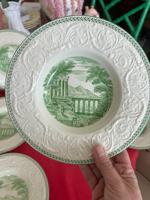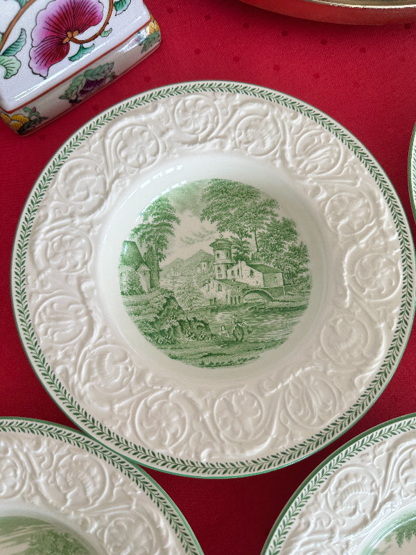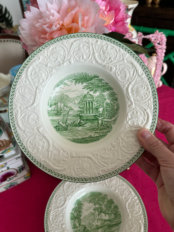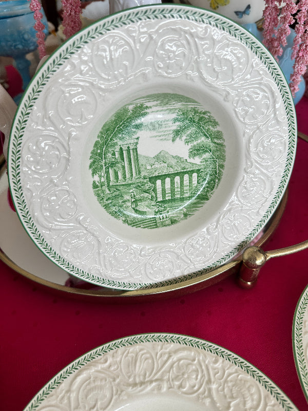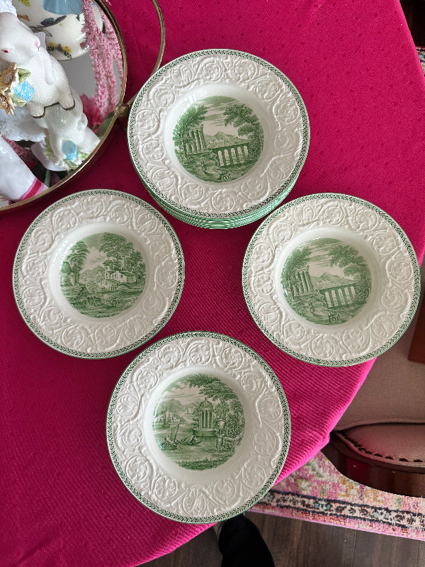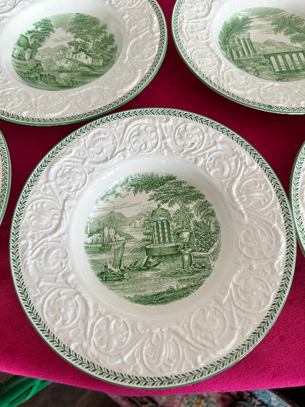 Want to dress up your table? This set of green and white Wedgwood bowls are the perfect addition. Great for a Springtime meal or for the holidays. 3 different Italian pastoral scenes in the set. Amazing detail in the porcelain on the rim. Stamped and marked on the back. This is a rare find! Amazing vintage condition.