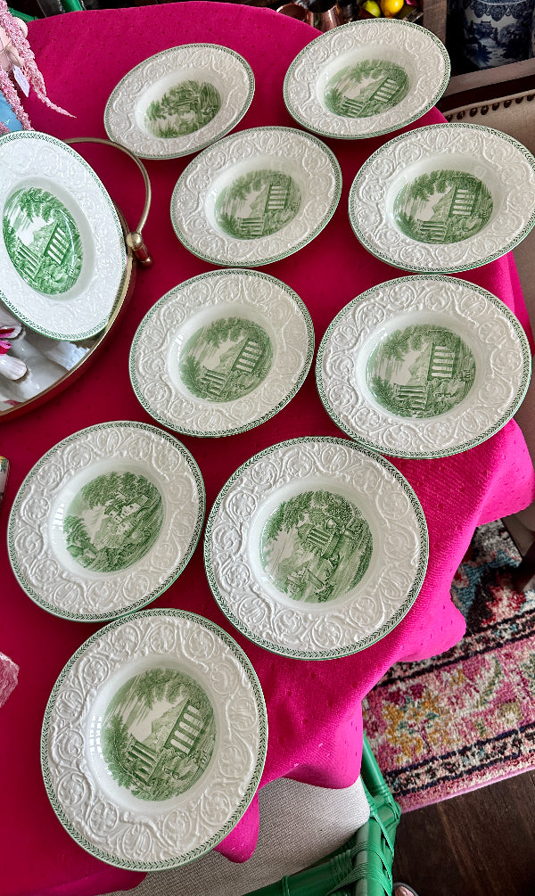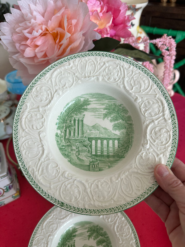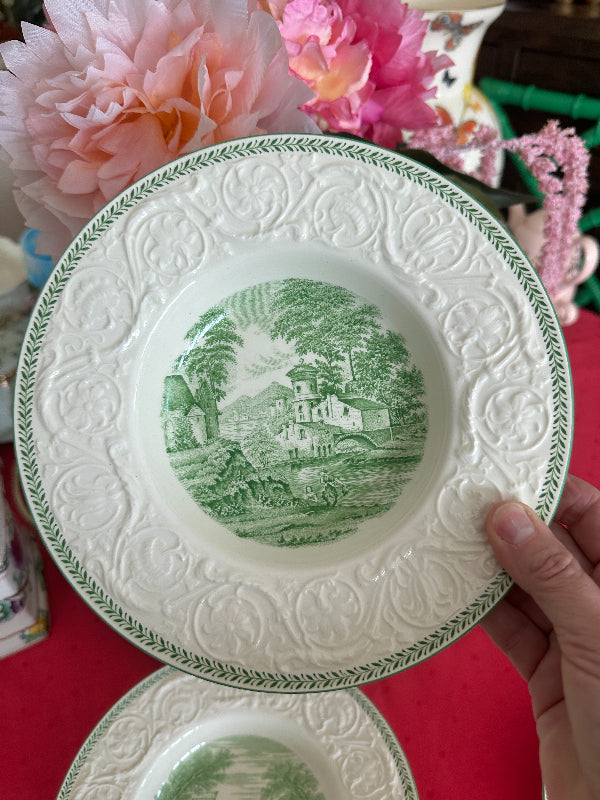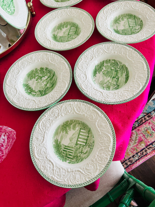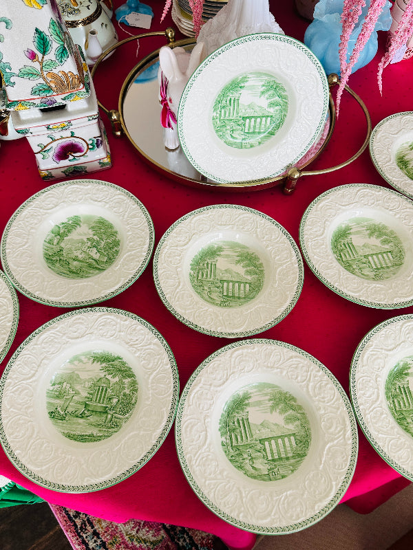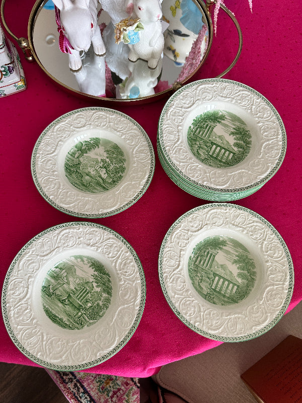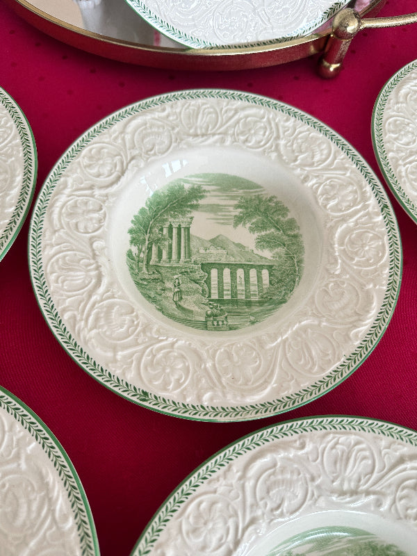 Want to dress up your table? This set of green and white Wedgwood bowls are the perfect addition. Great for a Springtime meal or for the holidays. 3 different Italian pastoral scenes in the set. Amazing detail in the porcelain on the rim. Stamped and marked on the back. This is a rare find! Amazing vintage condition.